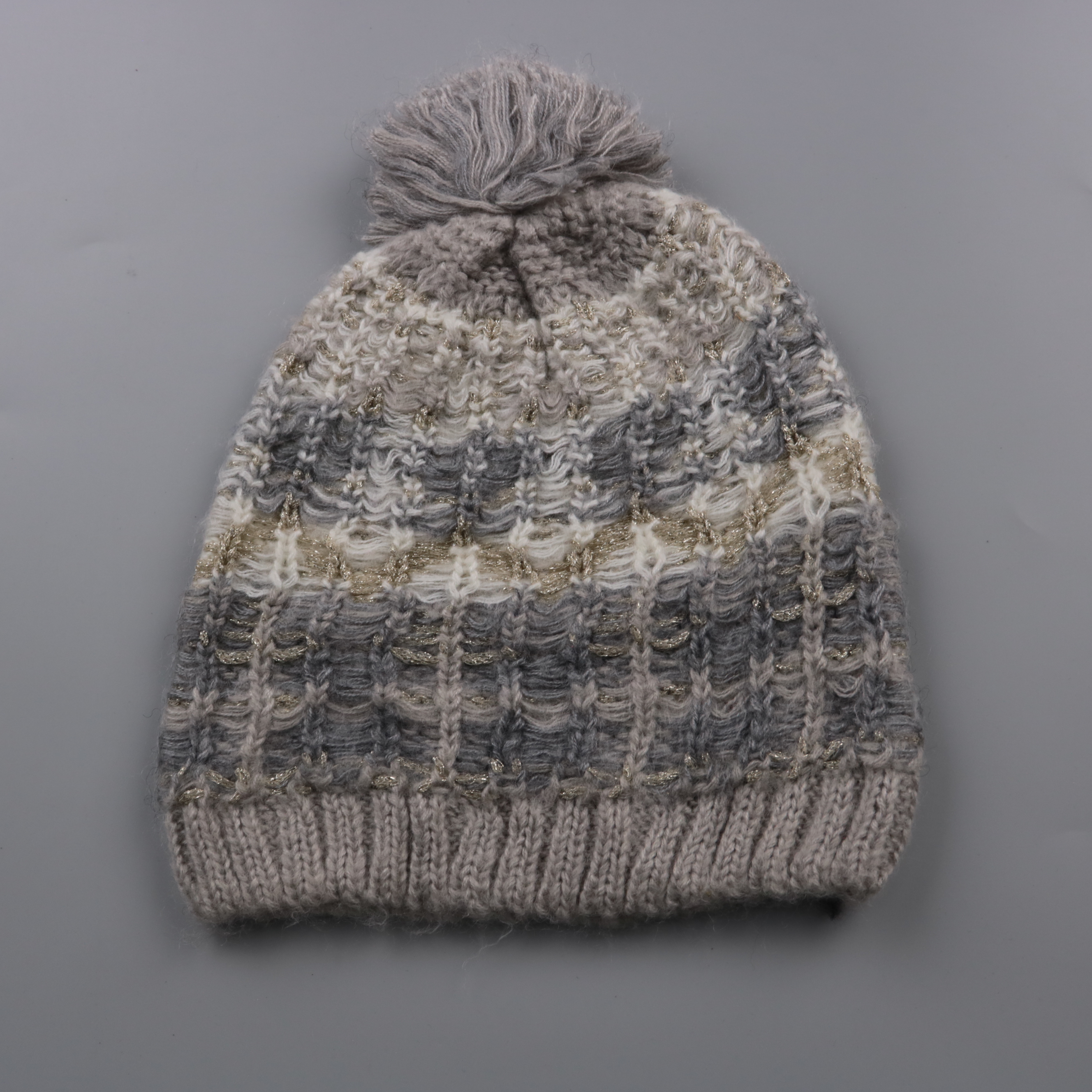Вязаная шапка-бини с помпоном в серо-бежевой гамме с золотистой нитью. Подойдёт для зимних прогулок и повседневных образов в холодную погоду. Плотная вязка помогает лучше сохранять тепло и защищает уши от ветра.