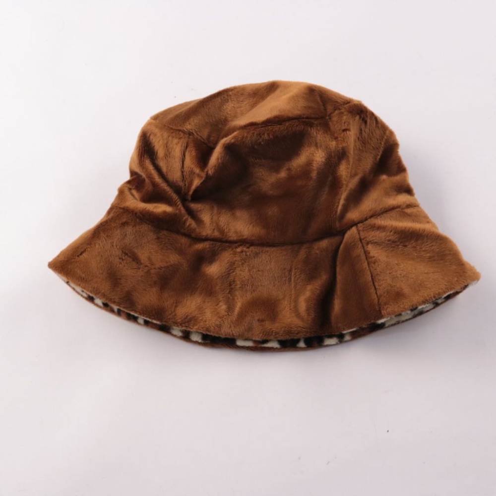 Панама из мягкого искусственного меха с леопардовой отделкой по краю. Подойдёт для прогулок и повседневных образов в прохладную погоду, добавляя акцент к базовой одежде. Лёгкая и компактная — удобно брать с собой и быстро надевать.
