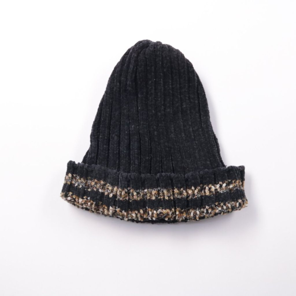Вязаная шапка-бини без указанного бренда, чёрного цвета с декоративной полосой по отвороту. Подойдёт для повседневной носки в холодную погоду и сочетания с пуховиками и пальто. Плотная вязка хорошо держит форму и защищает от ветра.