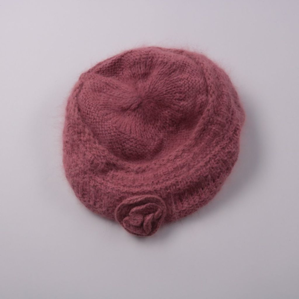 Вязаный берет с декором-цветком, мягкий и пушистый на ощупь. Подойдёт для зимних прогулок и городских образов. Тёплый материал с ангорой хорошо сохраняет тепло.