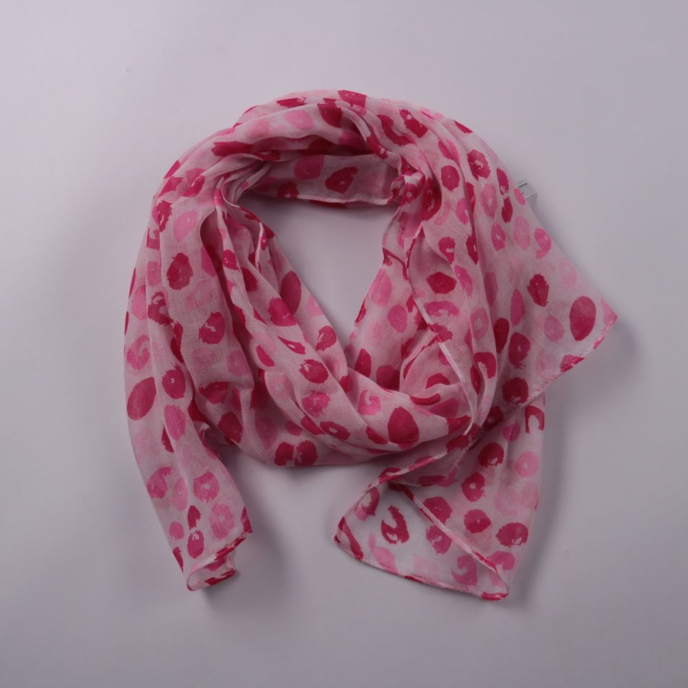 Лёгкий полупрозрачный шарф с розовым принтом в пятнышки, без указания бренда. Подойдёт для повседневных образов и как акцент к однотонной одежде в тёплый сезон и в помещении. Быстро сохнет и компактно складывается, удобно брать с собой.