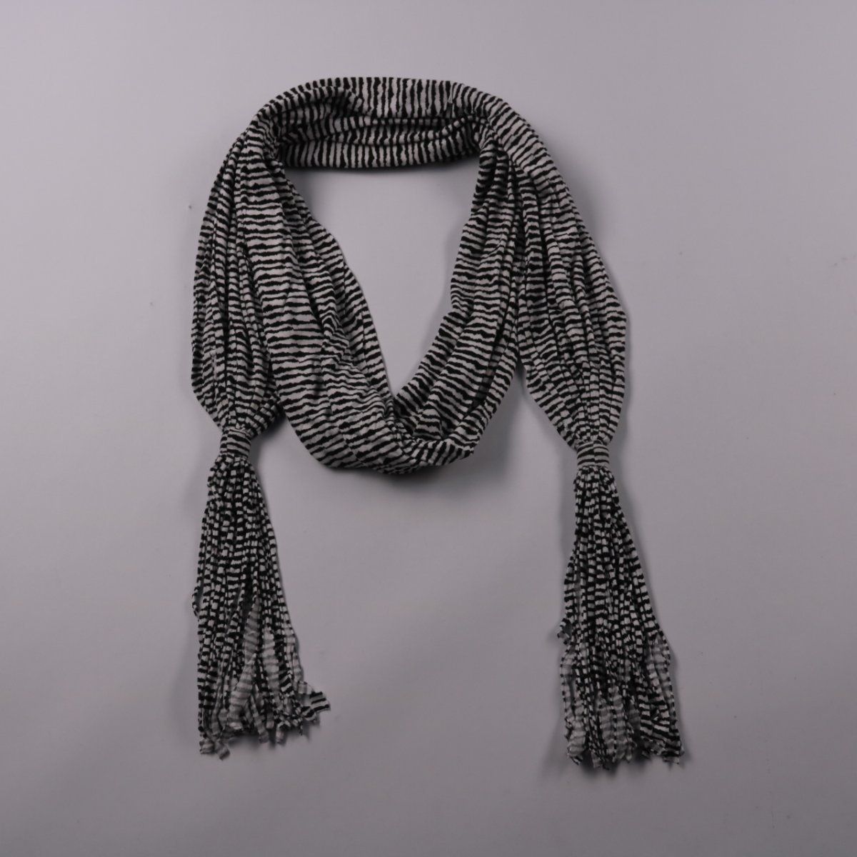 Шарф в чёрно-белую полоску с кисточками на концах. Подойдёт для повседневных образов и как акцент к однотонной верхней одежде. Лёгкий, удобно драпируется и завязывается разными способами.