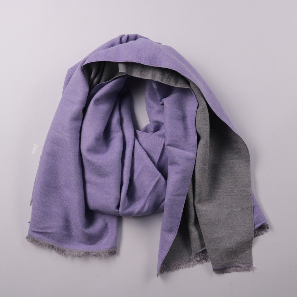 Двусторонний шарф без указанного бренда в сиренево-серой гамме с короткой бахромой по краям. Подойдёт для повседневных образов в прохладную погоду и для офиса. Мягкая смесь вискозы, шерсти и кашемира приятно лежит на шее и хорошо драпируется.