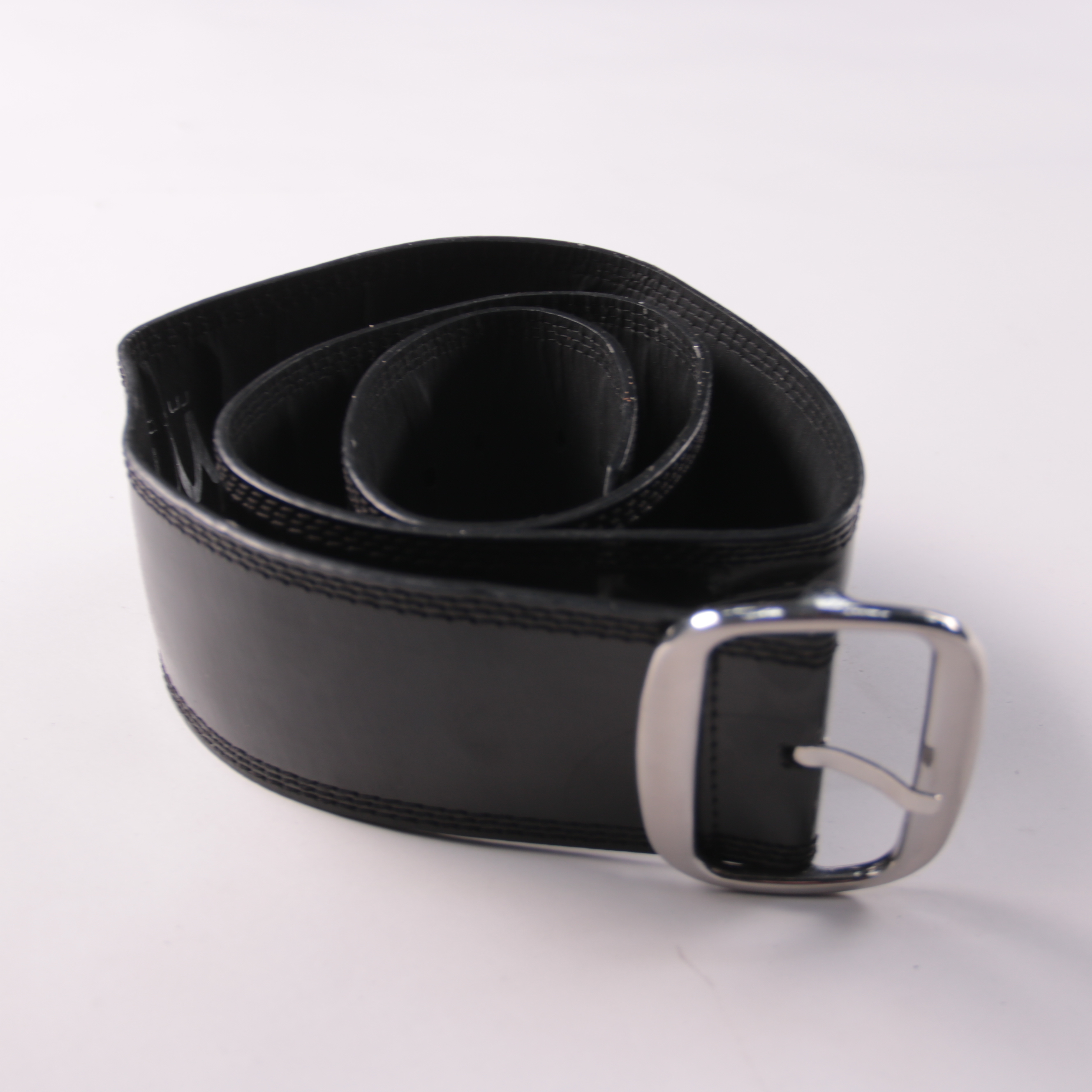 Чёрный ремень MSR с металлической пряжкой и лаковой фактурой. Подойдёт для повседневных образов и более строгих комплектов с брюками или джинсами. Материал из полиуретана практичен в уходе и легко протирается.