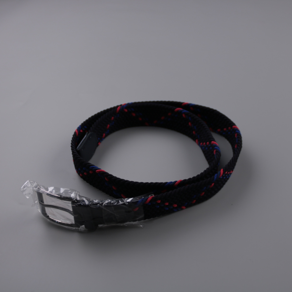 Плетёный ремень с пряжкой, выполнен в тёмно-синем цвете с красно-синим узором. Подойдёт для джинсов и брюк на каждый день, хорошо смотрится в casual-образах. Плетение позволяет легко подогнать ремень по талии без фиксированных отверстий.