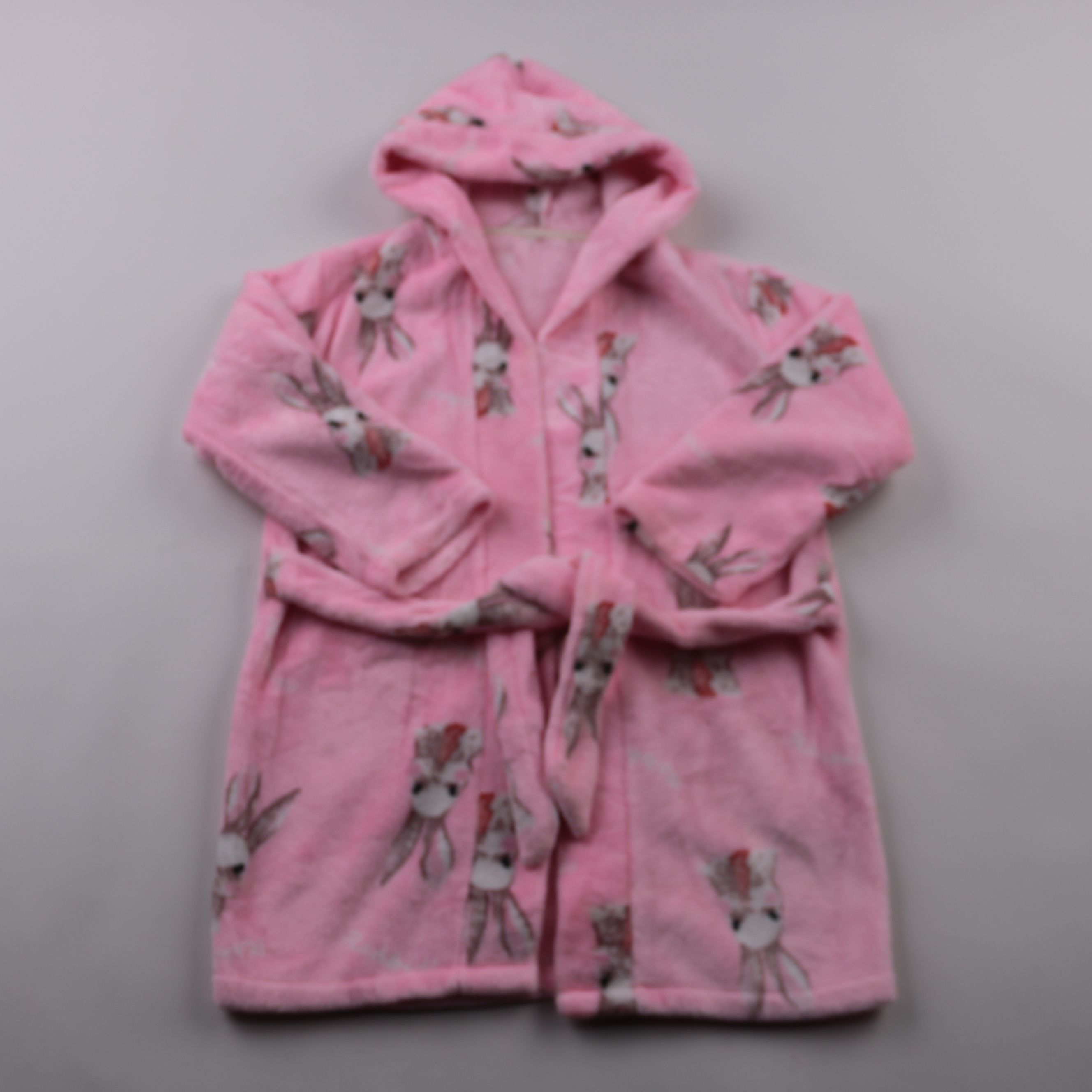 Детский домашний халат с капюшоном на поясе, розового цвета с принтом зайчиков. Подойдёт для дома после ванной или бассейна, чтобы быстро согреться. Мягкий полиэстер хорошо сохнет и не требует сложного ухода.