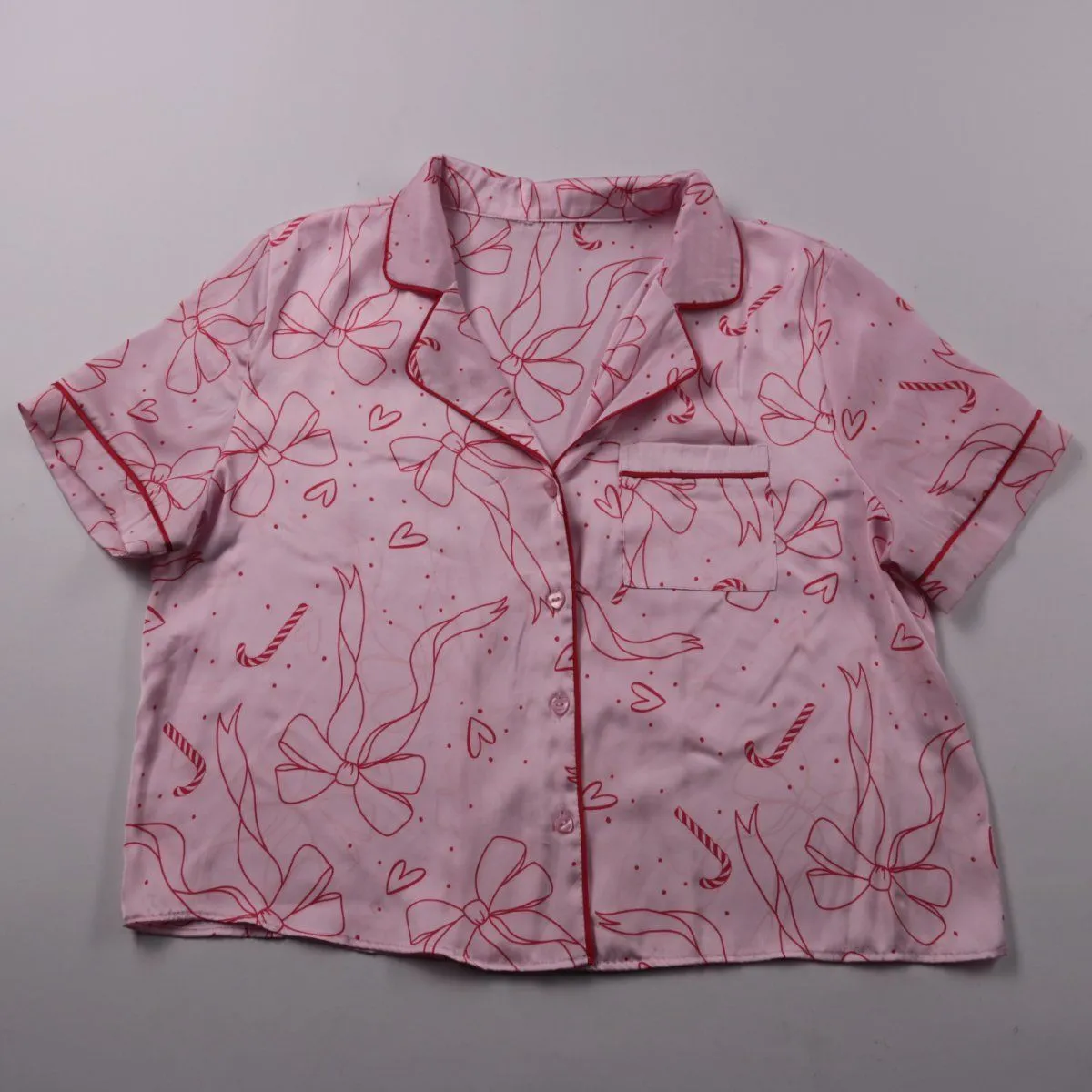 Детская пижамная рубашка с коротким рукавом и отложным воротником, с розовым принтом бантиков и сердечек. Подойдёт для сна и домашнего отдыха в тёплое время года или в квартире. Застёжка на пуговицы позволяет быстро переодеть ребёнка.