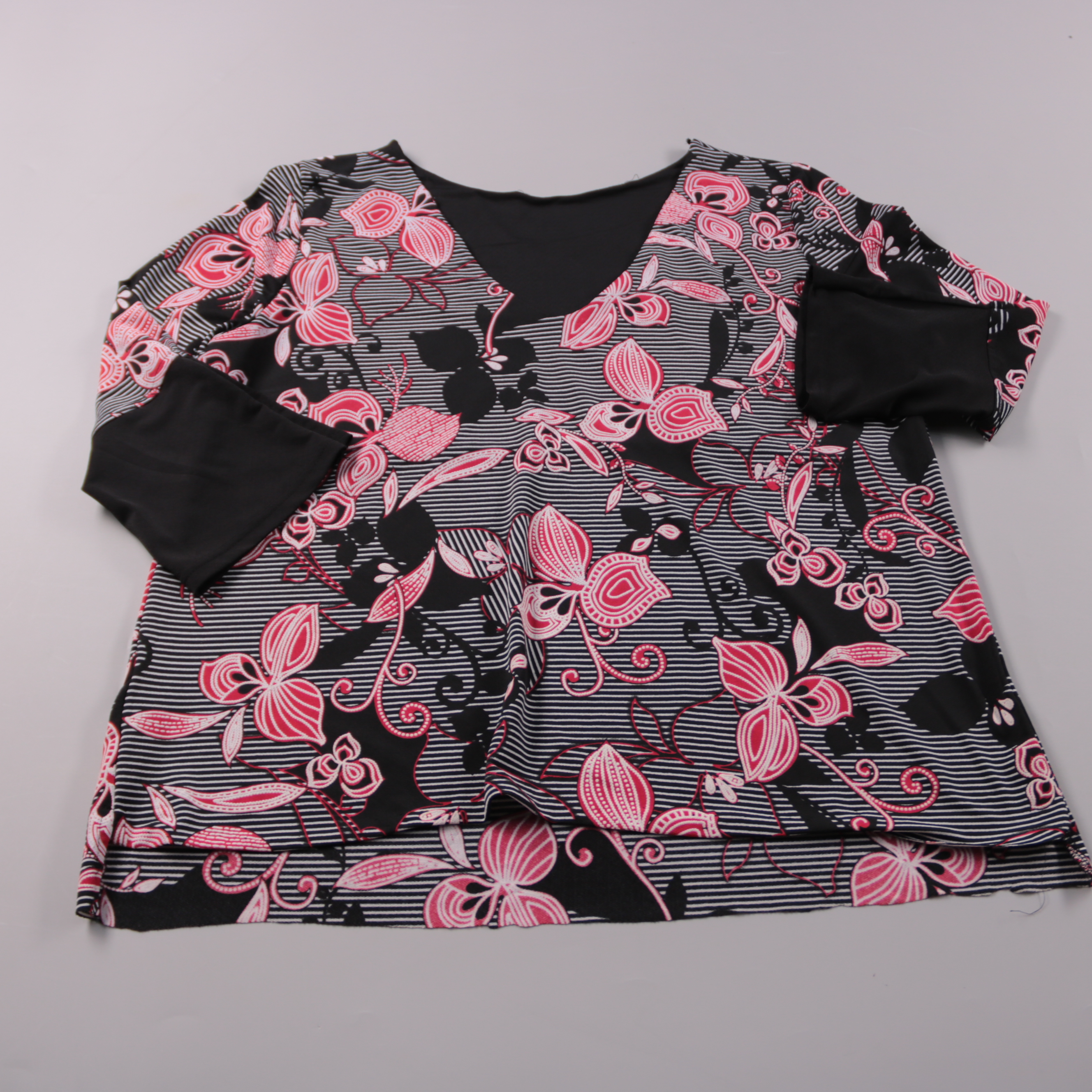 Детская блузка с V-образным вырезом и ярким принтом (полоски и цветы) в черно-розовой гамме. Подойдет для школы, праздников и повседневной носки, легко сочетать с юбкой или брюками. Ткань практичная и не требует сложного ухода.