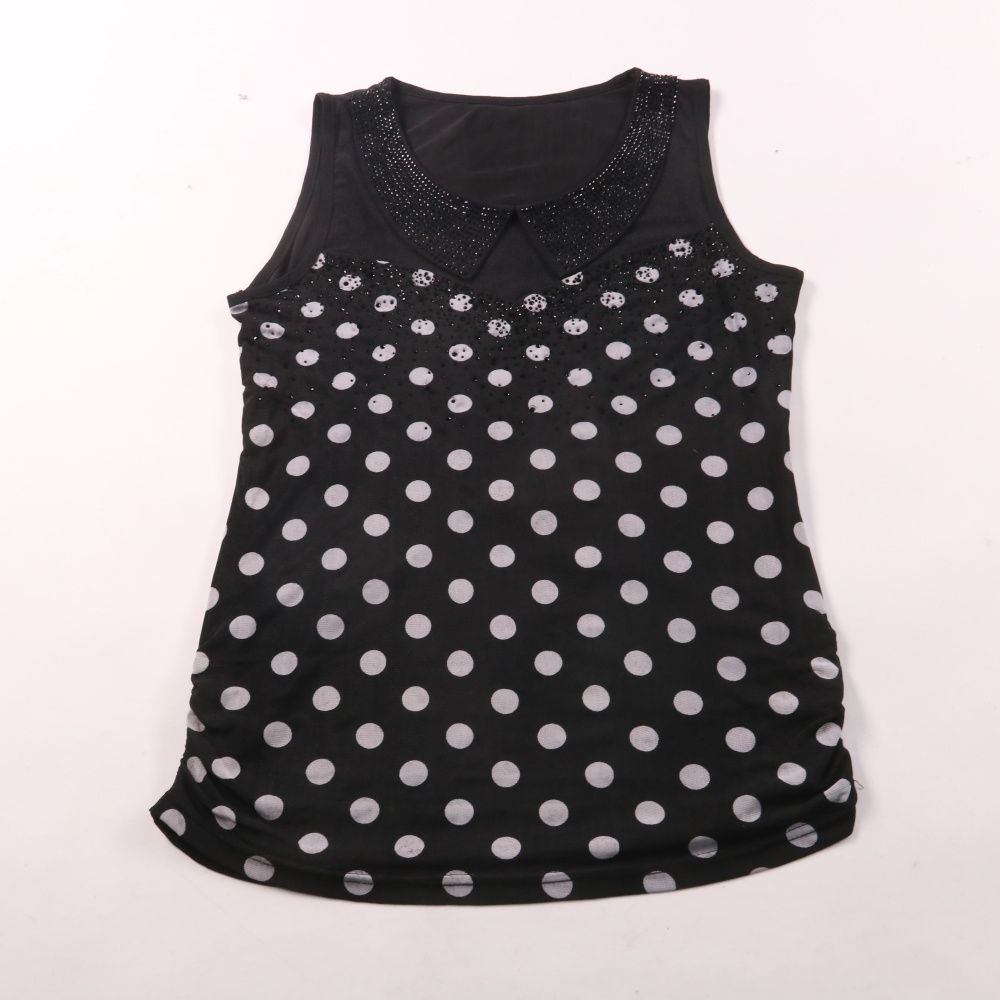 Топ без рукавов в чёрном цвете с белым горохом, с декоративным воротничком с блёстками. Подойдёт для лета и нарядных выходов, можно носить с юбкой или шортами. Ткань из полиэстера быстро сохнет и проста в уходе.