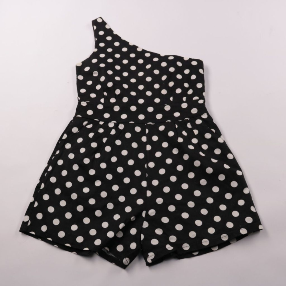 Летний комбинезон 83girl чёрного цвета в белый горошек, с асимметричным верхом на одно плечо и шортами. Подойдёт для прогулок, праздников и поездок в тёплую погоду. Лёгкий крой не стесняет движений и быстро сохнет после стирки.