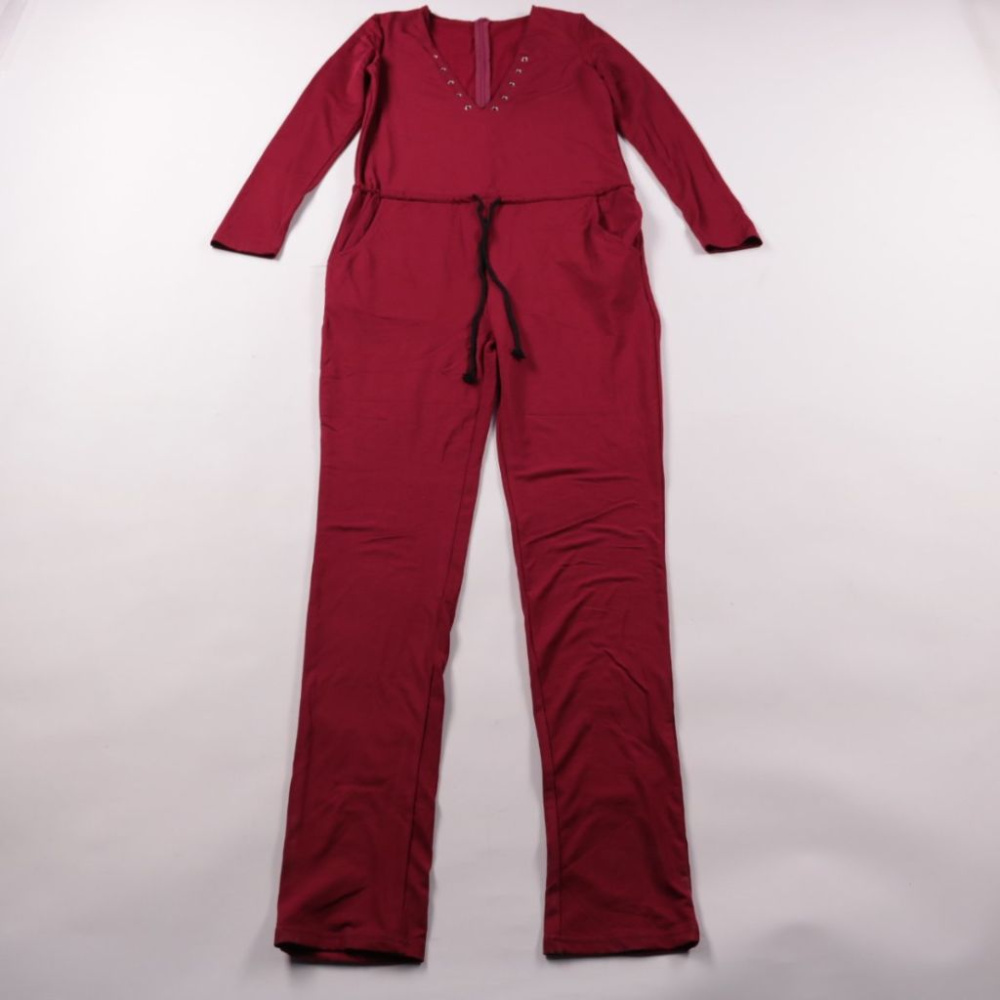 Бордовый комбинезон из хлопка с длинным рукавом, шнурком на талии и карманами. Подойдёт для дома, прогулок и повседневной носки в прохладную погоду. Натуральный материал приятен к телу и хорошо пропускает воздух.