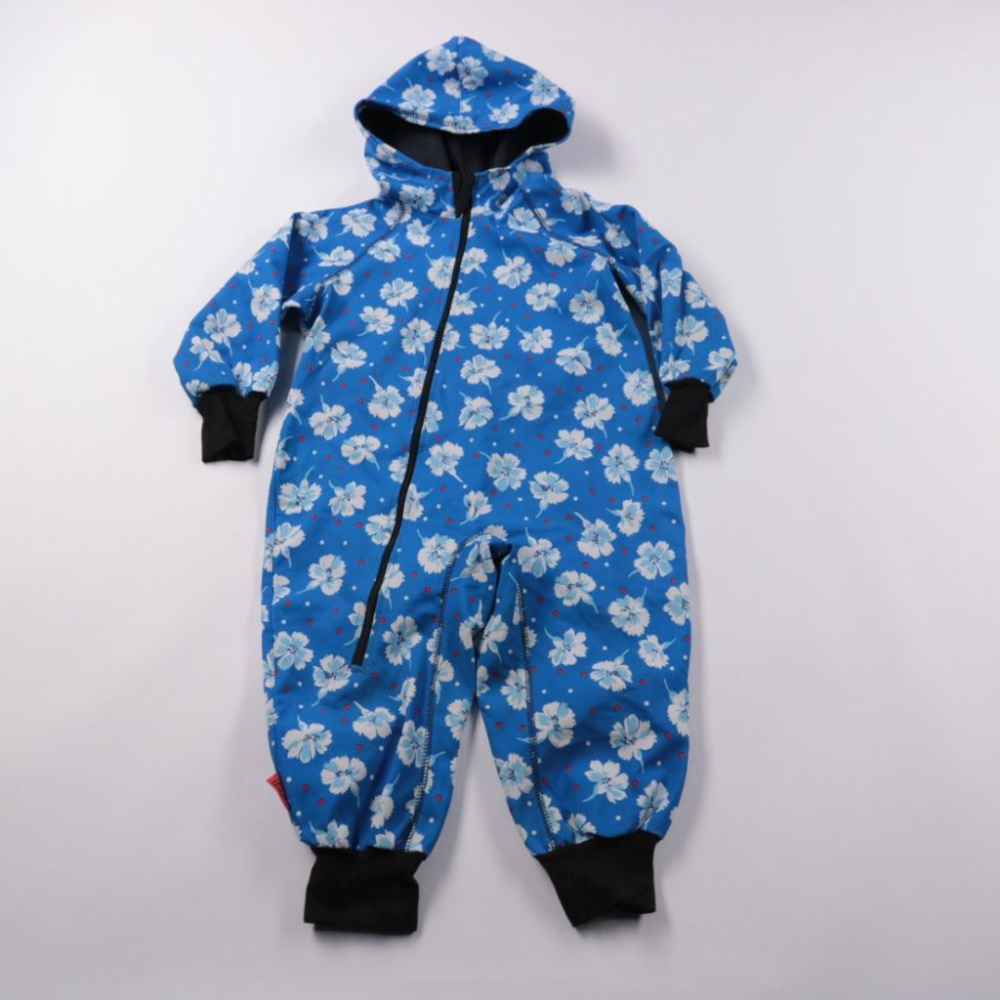 Комбинезон iELM для девочки из микрополиэстера, с капюшоном и цветочным принтом на синем фоне. Подойдёт для прогулок в прохладную погоду весной и осенью, застёгивается на молнию. Манжеты на рукавах и штанинах помогают лучше держать тепло и не задираться.