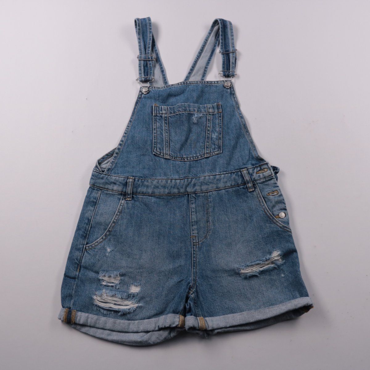 Джинсовый комбинезон Clockhouse с короткими шортами и эффектом лёгких потертостей. Подойдёт для летних прогулок и поездок, хорошо сочетается с футболками и топами. Плотный хлопковый деним практичен в носке и легко стирается.