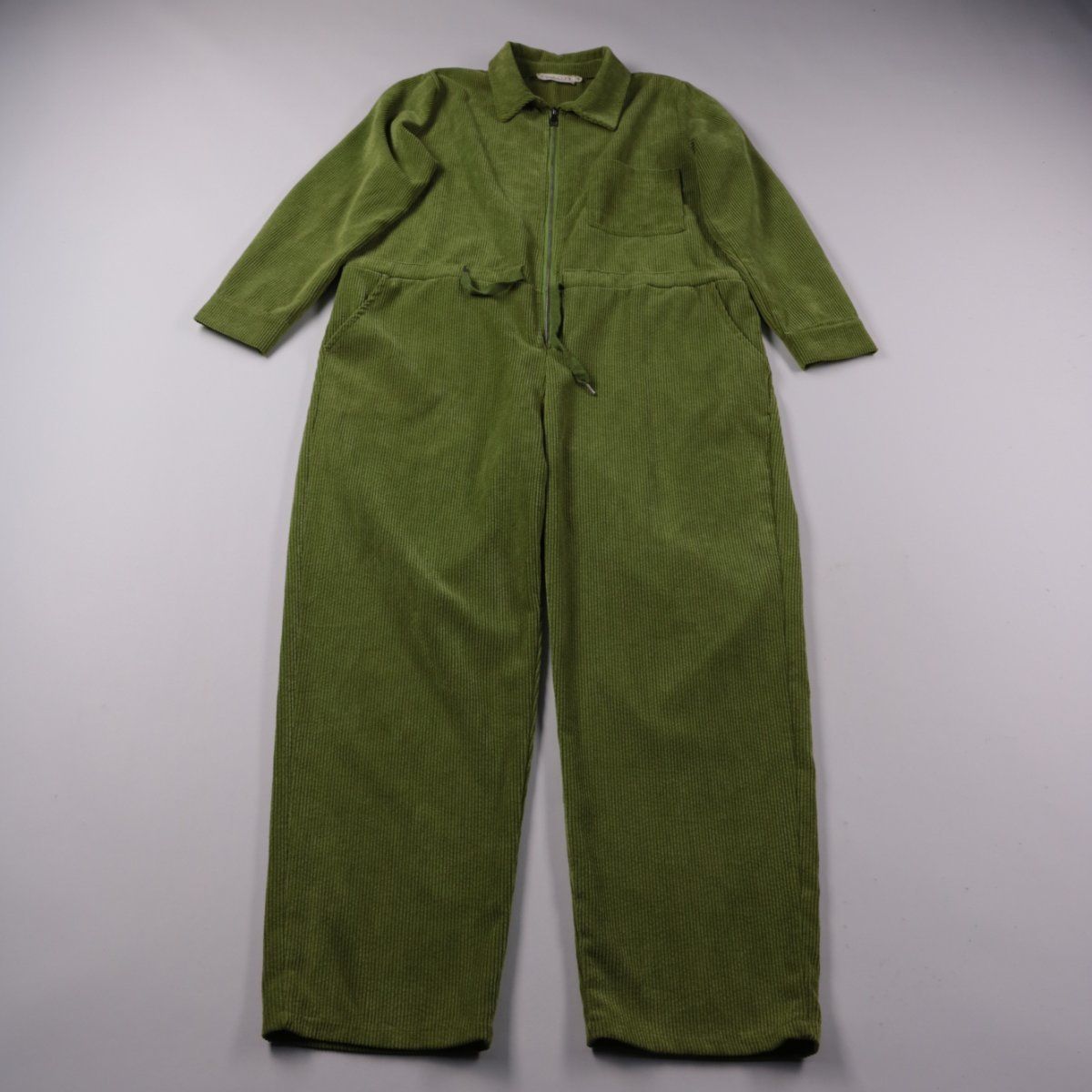Вельветовый комбинезон Lolaliza оливково-зелёного цвета на молнии, с воротником и карманами. Подойдёт для прогулок и повседневной носки в прохладную погоду, удобно надевать за счёт застёжки спереди.
