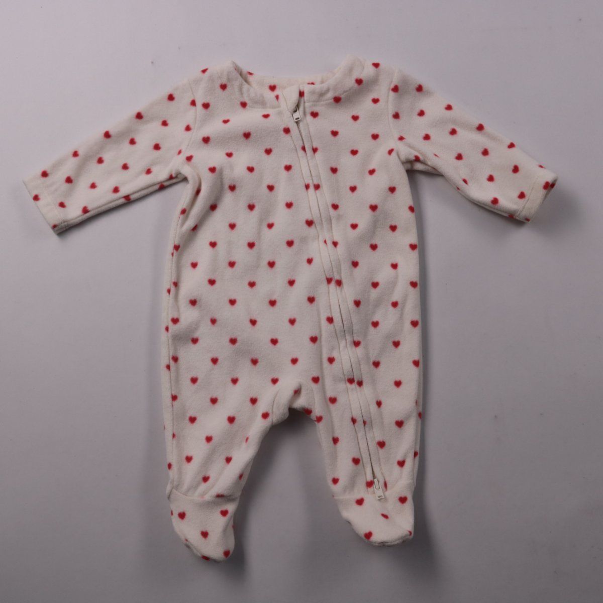 Нательный комбинезон George белого цвета с принтом красных сердечек, на молнии и с закрытыми ножками. Подойдёт для сна и домашнего использования в прохладное время. Молния по всей длине помогает быстро переодеть ребёнка.