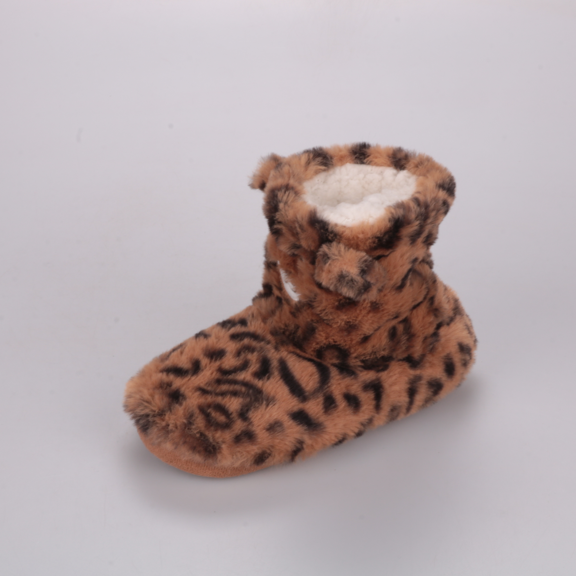 Домашние тапочки из мягкого искусственного меха с леопардовым принтом и тёплой подкладкой. Подойдут для дома и детского сада, хорошо фиксируются на ножке благодаря высокой посадке. Нескользящая подошва помогает увереннее ходить по гладкому полу.