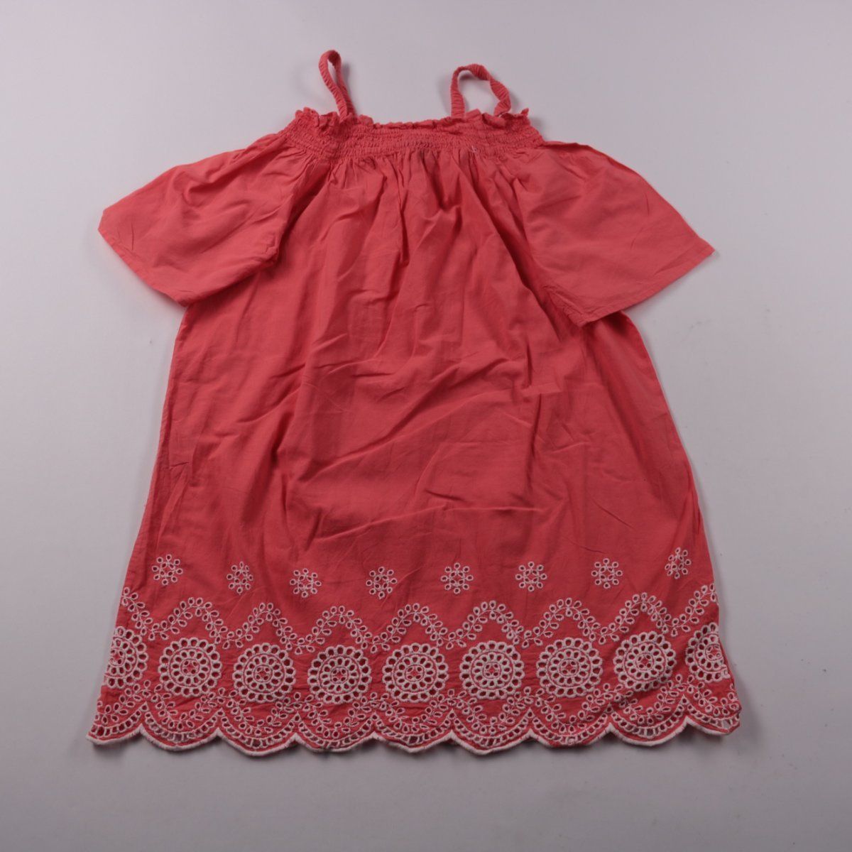Детское летнее платье для девочки кораллово-розового цвета с бретелями и короткими рукавами. Низ украшен белым вышитым кружевом, верх на эластичной сборке — удобно надевать и комфортно сидит. Подойдёт для прогулок и праздников, материал простой в уходе.