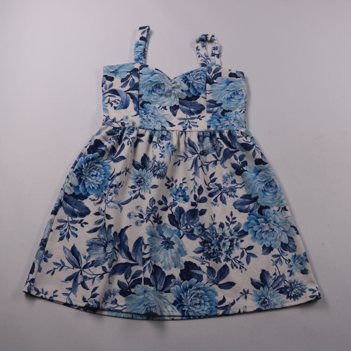 Детское платье на бретелях с цветочным принтом в сине-голубых тонах на белом фоне. Подойдёт для летних прогулок и праздников, силуэт с отрезной талией и расклешённой юбкой. Практично тем, что легко комбинируется с кардиганом и быстро сохнет после стирки.