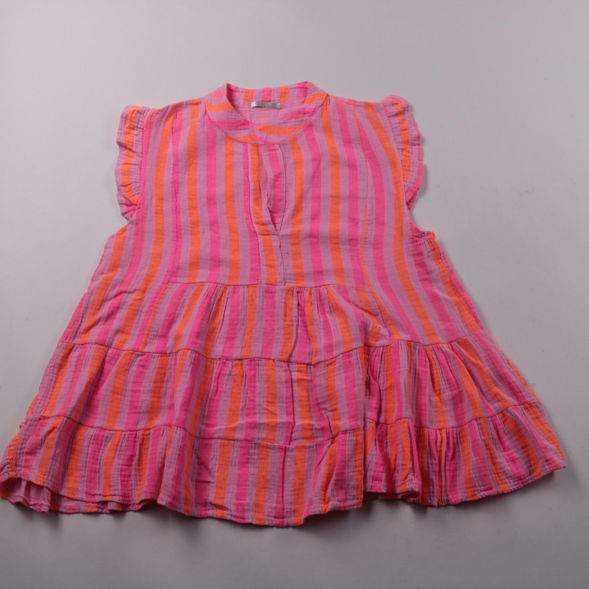 Детское платье для девочки в яркую розово-оранжевую полоску, без рукавов, с воланами по проймам и ярусной юбкой. Подойдёт для лета, прогулок и отдыха. Лёгкая ткань хорошо пропускает воздух и не стесняет движений.