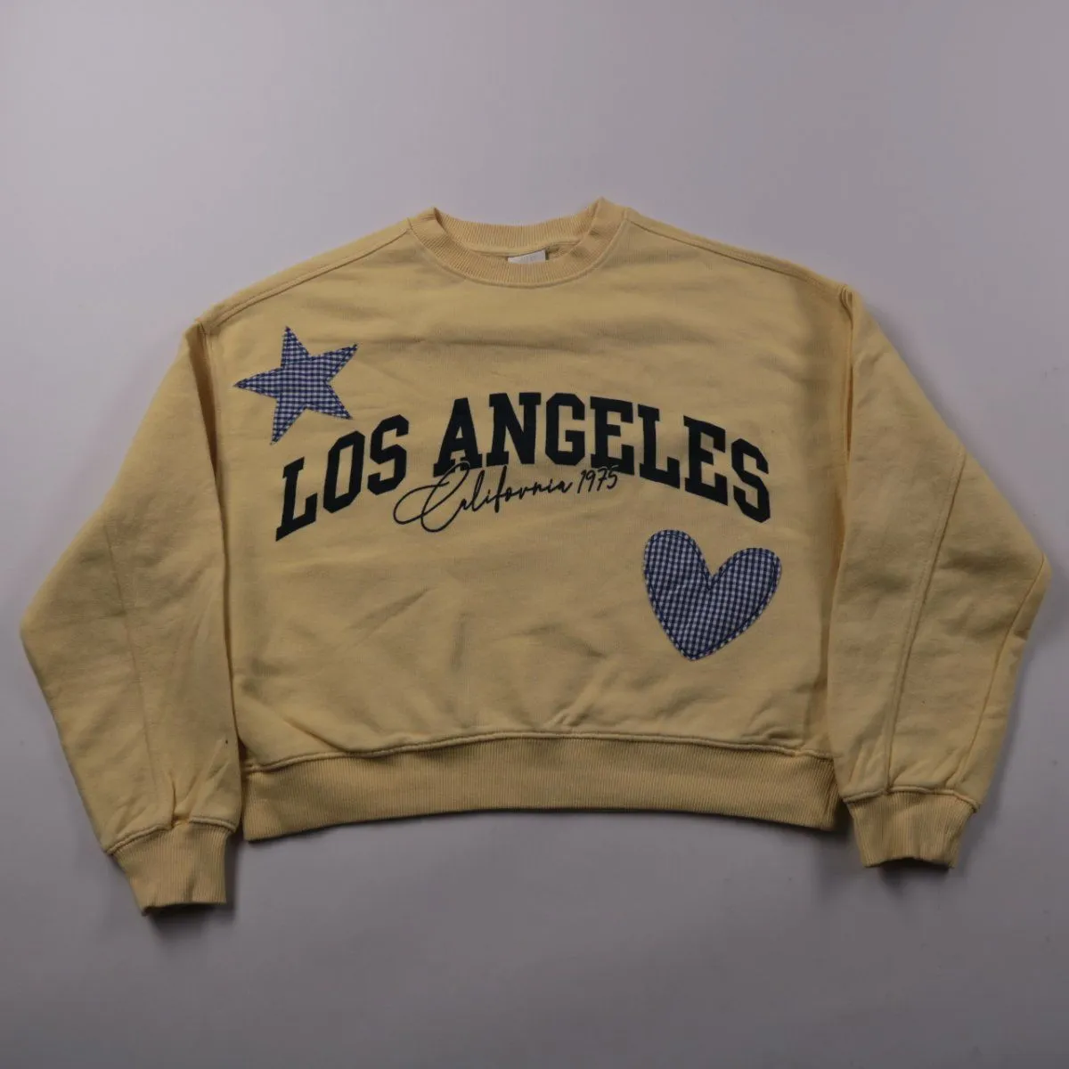 Свитшот ZARA для девочки в бежево-жёлтом оттенке с принтом Los Angeles и нашивками (звезда и сердце). Подойдёт для школы и прогулок в прохладную погоду, легко сочетать с джинсами или леггинсами. Натуральный хлопок приятен к телу и хорошо дышит.