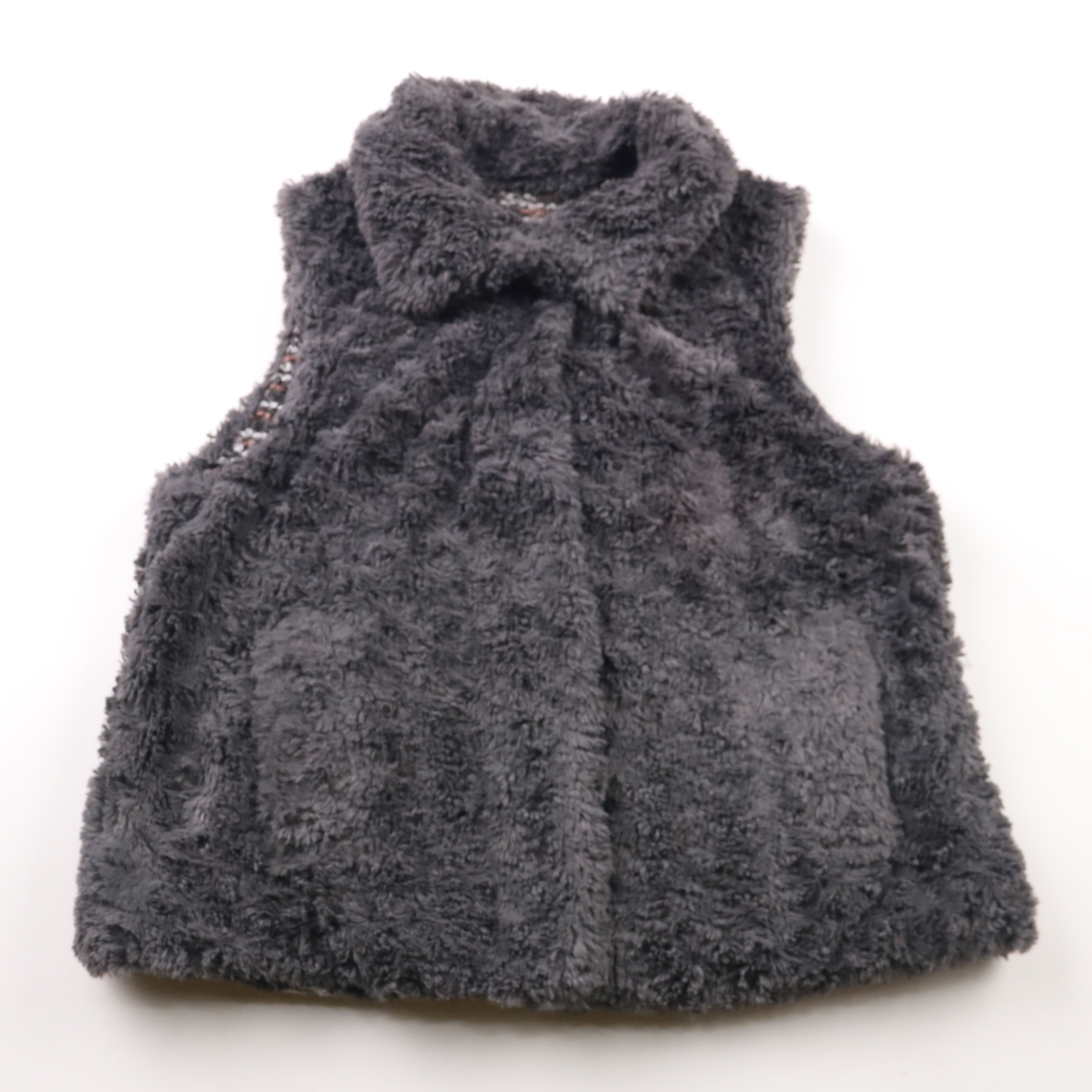 Мягкий пушистый жилет без бренда, серого цвета, с высоким воротником. Подойдёт для прохладной погоды в демисезон: удобно надевать поверх лонгслива или свитера на прогулку. Лёгкий и тёплый, не сковывает движения и быстро сохнет.