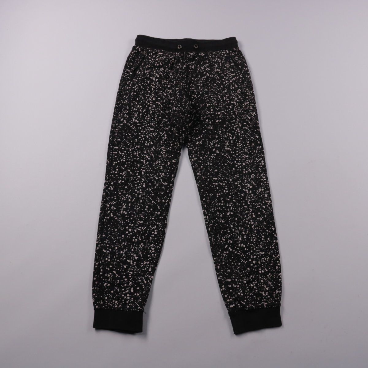 Брюки Arrested из хлопка, чёрные с принтом «крапинки», на поясе шнурок и манжеты снизу. Подойдут для школы, прогулок и дома в любое время года. Мягкий трикотаж хорошо тянется и не стесняет движений.