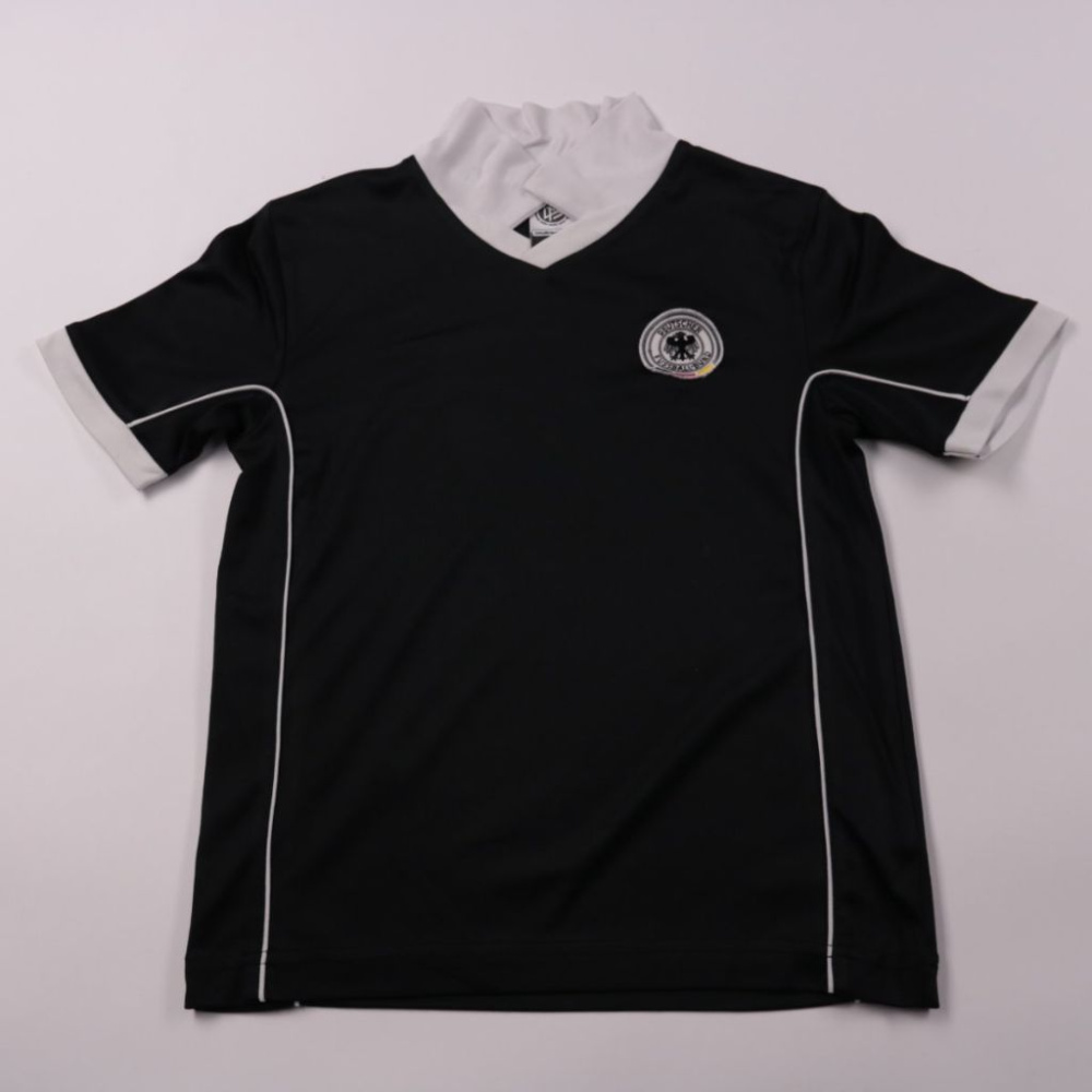 Футболка DFB Fanshop чёрного цвета с белым воротником и эмблемой на груди, выполнена из полиэстера. Подойдёт для спорта, тренировок и активных прогулок. Материал быстро сохнет и не требует сложного ухода.