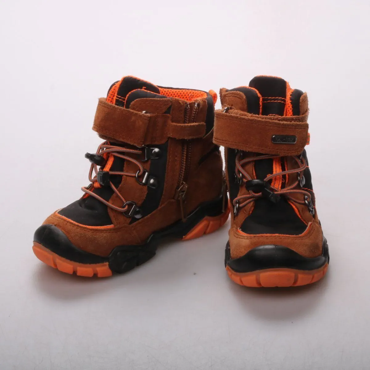 Детские ботинки Elefanten из замши и текстиля в коричнево-чёрной расцветке с оранжевыми деталями. Подойдут для прогулок в прохладную погоду, фиксируются липучкой, шнуровкой и молнией сбоку. Рельефная подошва помогает устойчивее держаться на мокрых и неровных дорожках.