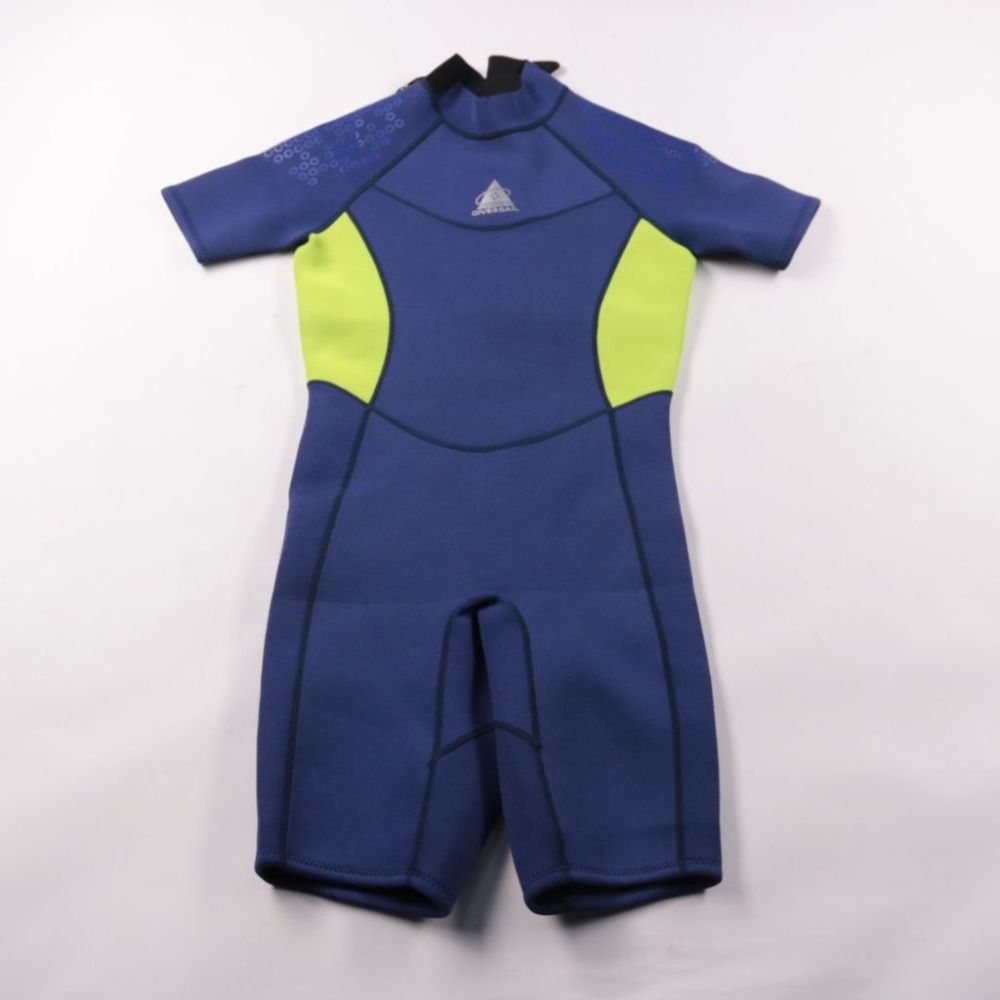 Детский гидрокостюм Dive & Sail из неопрена, короткий с рукавами, в сине-зелёной расцветке. Подойдёт для моря, бассейна и пляжных активностей, помогает сохранить тепло в воде. Материал тянется и плотно сидит по фигуре, быстро сохнет после купания.