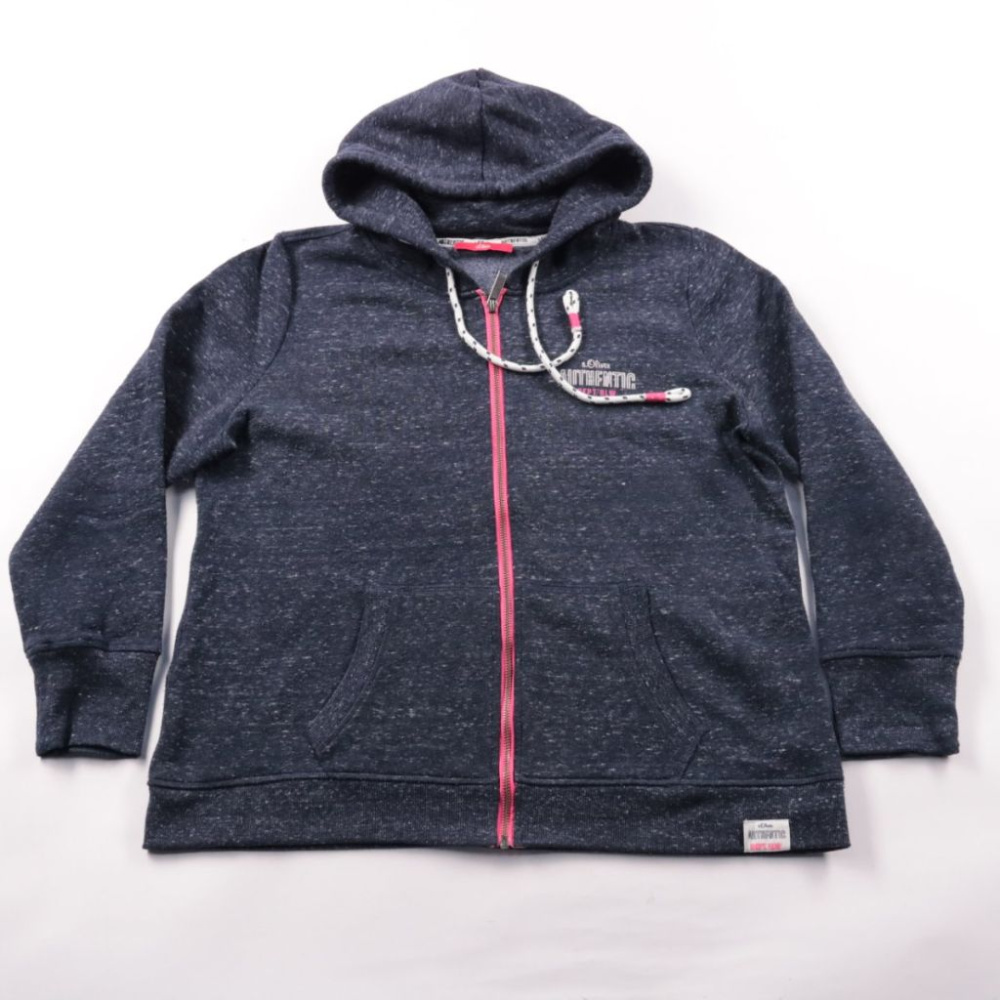 Толстовка S.Oliver на молнии с капюшоном, тёмно-синего меланжевого цвета, с карманами-кенгуру и шнурком. Подойдёт для прогулок и школы в прохладную погоду, удобно носить поверх футболки или лонгслива. Практична тем, что быстро надевается и снимается бл...