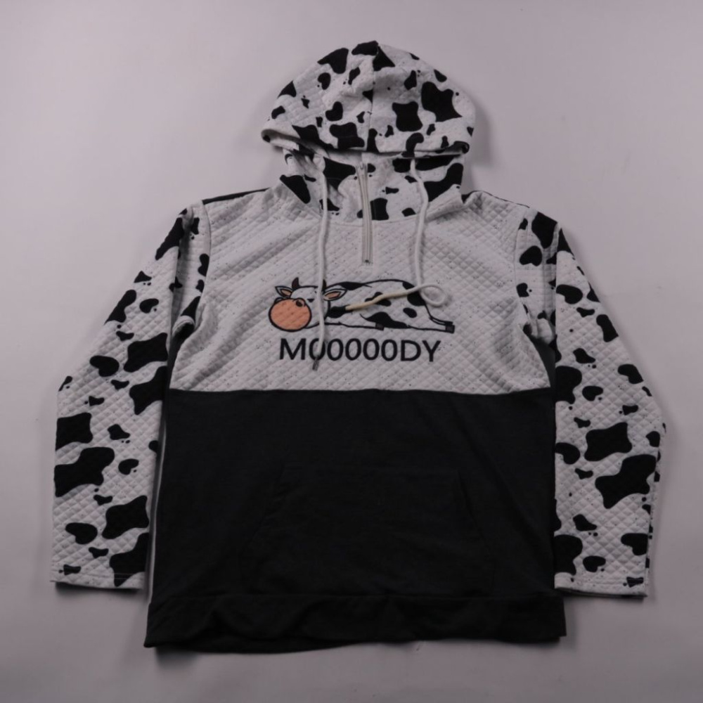Худи Mooooody с капюшоном и короткой молнией, с принтом «коровка» и вышивкой на груди. Подойдёт для повседневной носки в школу или на прогулки в прохладную погоду. Мягкий материал и капюшон помогают сохранять тепло и защищают от ветра.
