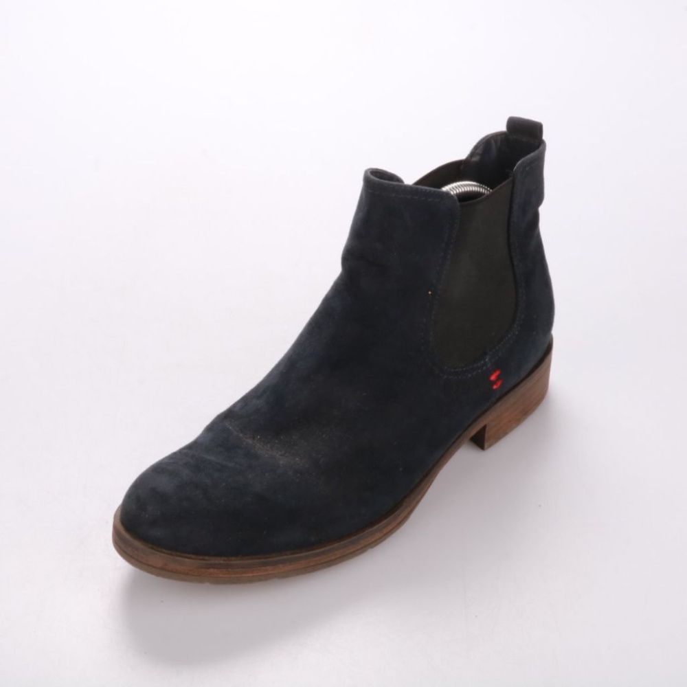 Мужские замшевые ботинки челси тёмно-синего цвета с эластичными вставками по бокам и низким каблуком. Подойдут для повседневных образов в межсезонье и на выход, хорошо сочетаются с джинсами и брюками. Практичное преимущество — удобное надевание без шну...