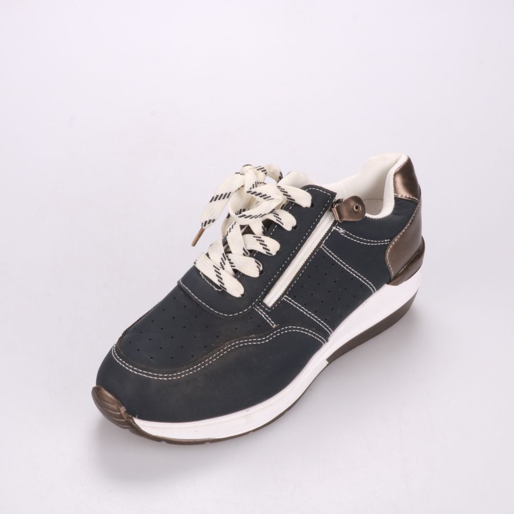Мужские кроссовки в темно-синем цвете с белой подошвой и коричневыми вставками, со шнуровкой и боковой молнией. Подойдут для повседневной носки в городе и на работу в демисезон и прохладные дни. Молния сбоку помогает быстрее надевать и снимать обувь.