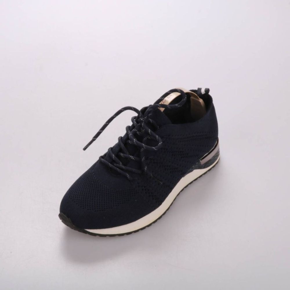 Кроссовки в тёмно-синем цвете с перфорацией и шнуровкой, бренд не указан. Подойдут для повседневной носки и прогулок в городе. Лёгкая подошва с протектором даёт устойчивость на асфальте и плитке.