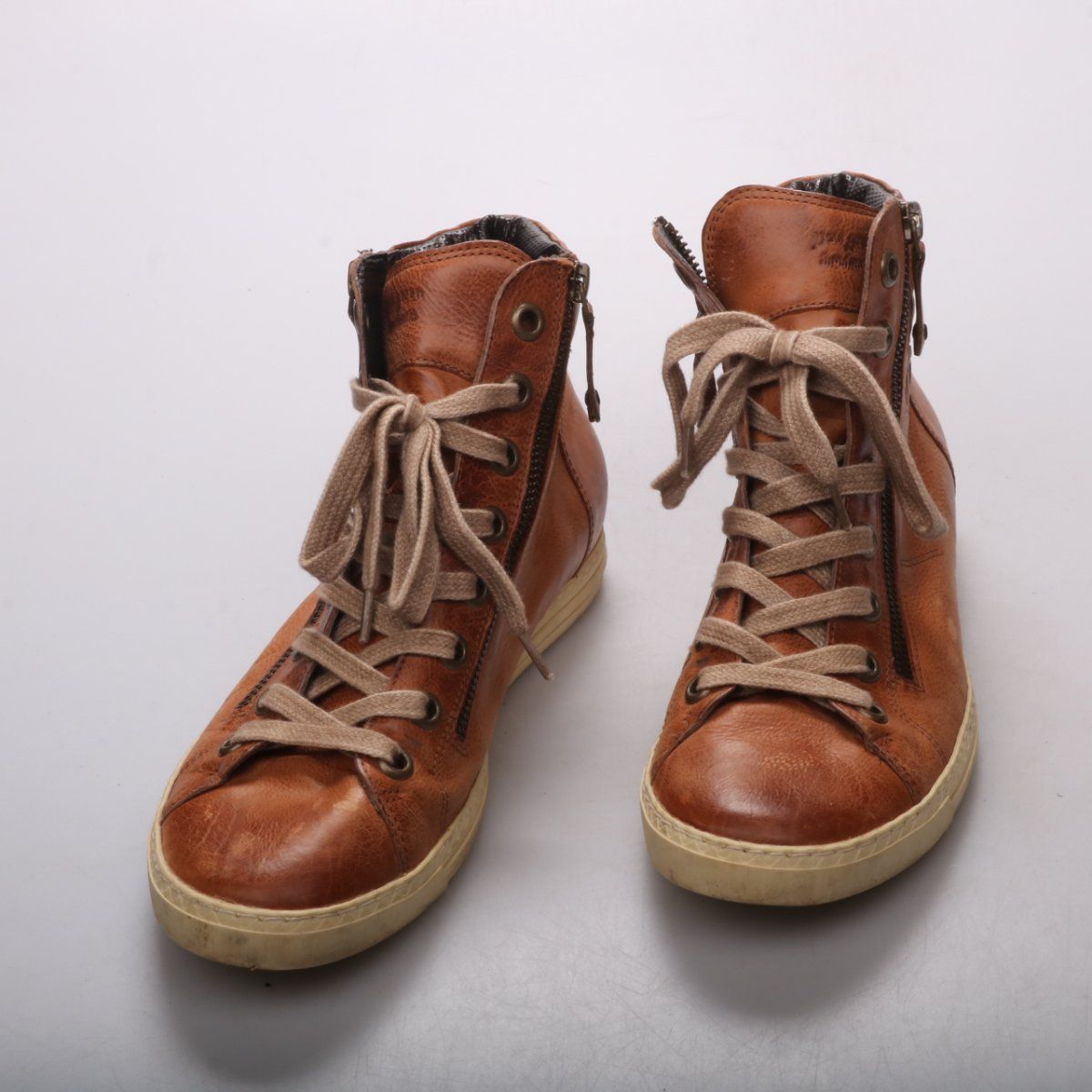 Кожаные высокие кроссовки Paul Green коричневого цвета на светлой подошве, со шнуровкой и боковой молнией. Подойдут для повседневной носки в городе в межсезонье. Молния сбоку позволяет быстро надевать и снимать обувь.