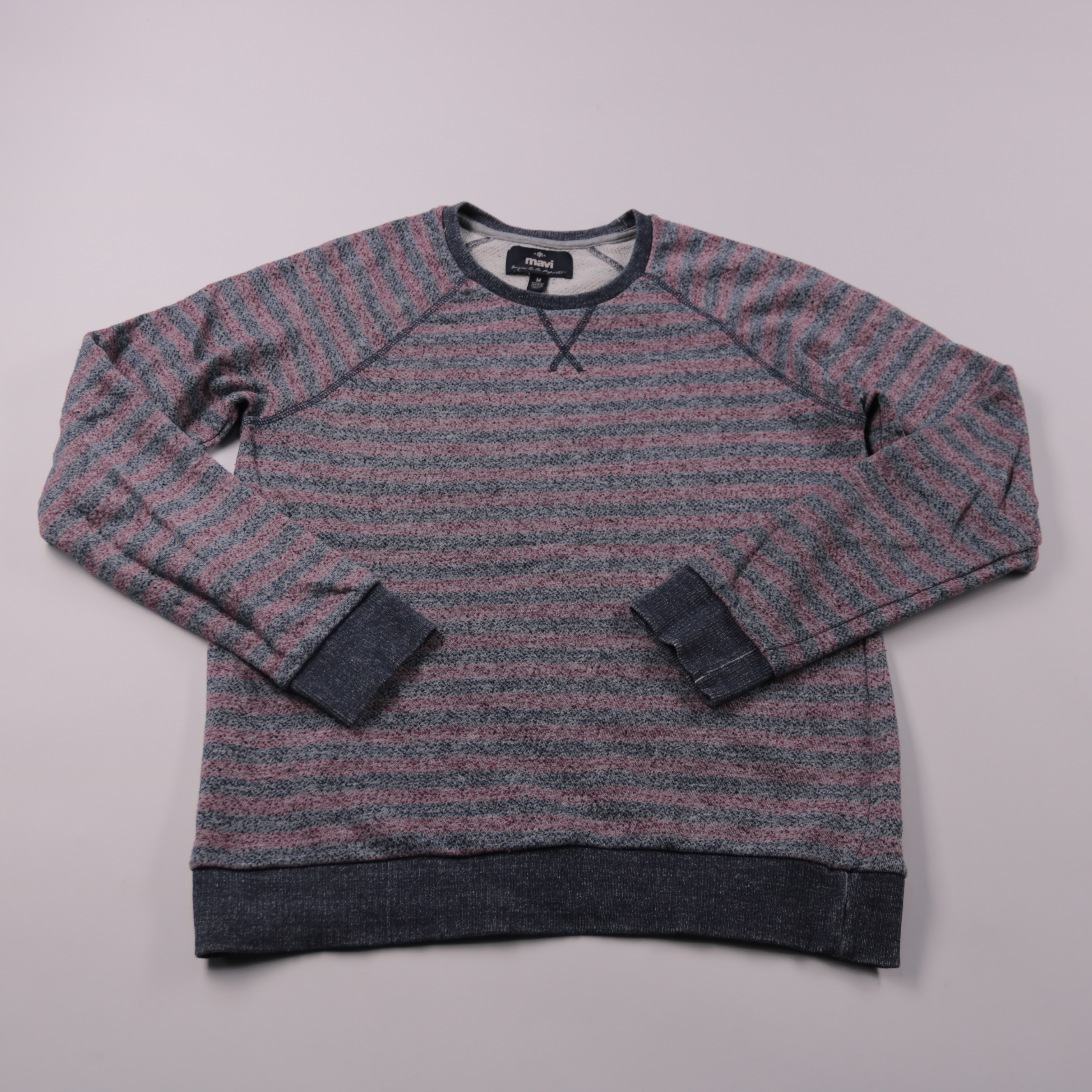 Мужской свитшот Mavi в серо-бордовую полоску, с круглым вырезом и манжетами. Подойдёт для повседневных образов в прохладную погоду и как второй слой под куртку. Трикотаж с полиэстером в составе меньше мнётся и проще в уходе.