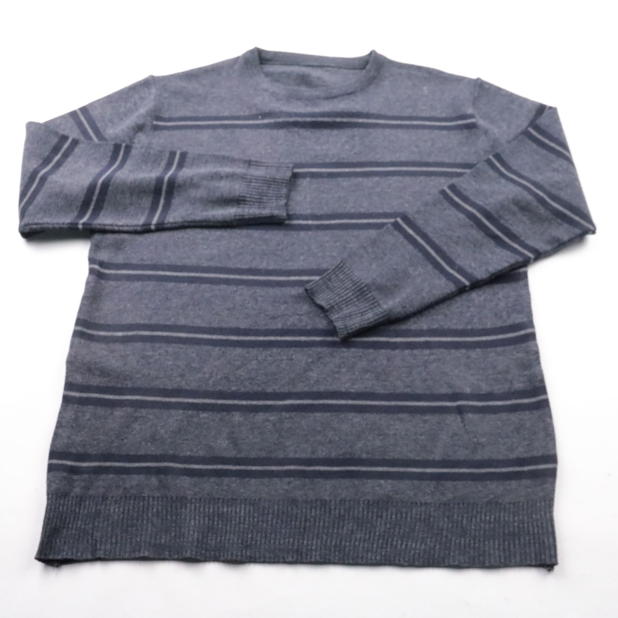 Мужской джемпер в сером цвете с горизонтальными полосками и круглым вырезом. Подойдёт для повседневной носки в прохладную погоду и как слой под куртку или пальто. Смесовая пряжа с шерстью и эластаном хорошо держит форму и тянется.