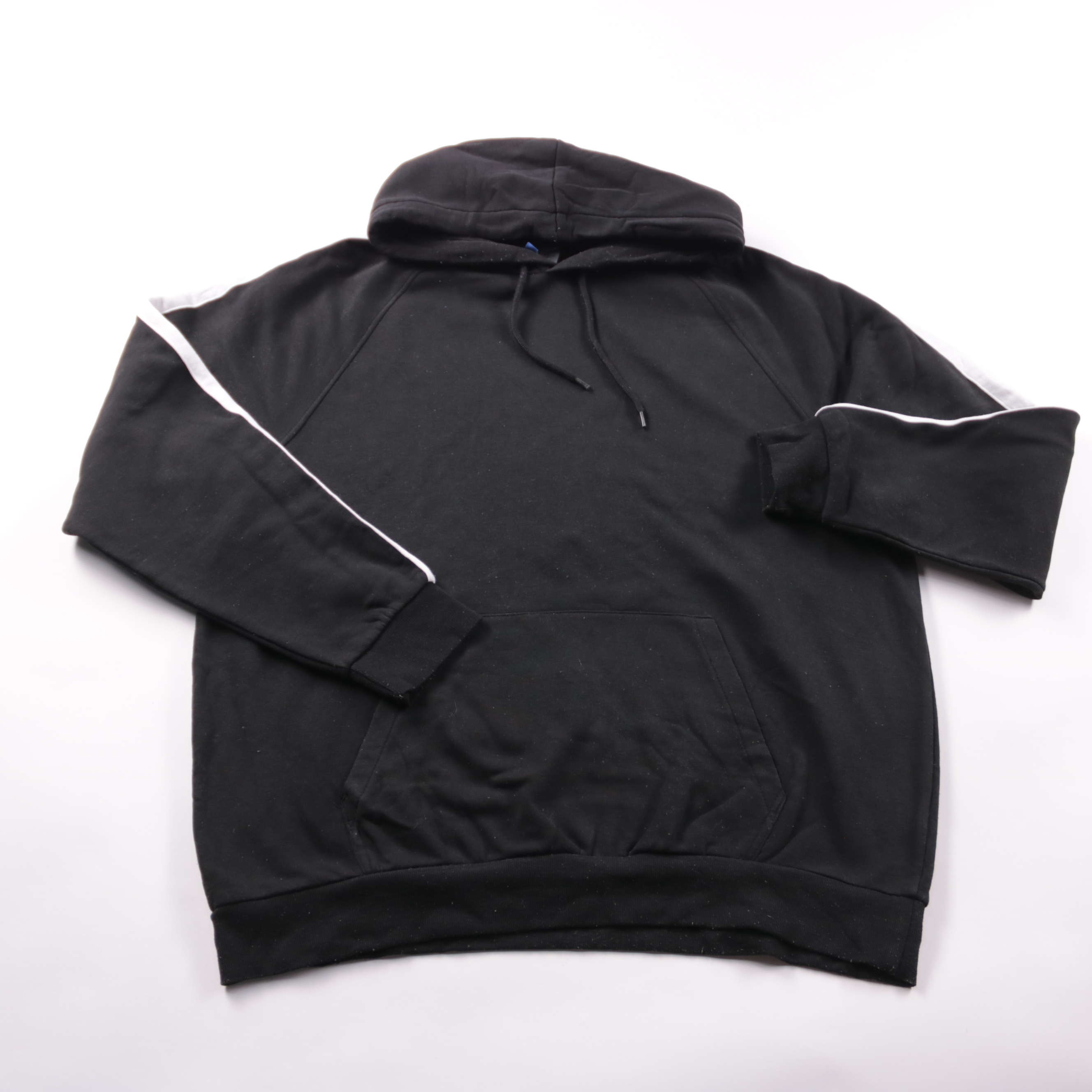 Мужское худи H&M чёрного цвета с капюшоном и карманом-кенгуру, по рукавам — белые вставки. Подойдёт для повседневной носки и прогулок в прохладную погоду. Мягкая ткань с подкладкой капюшона и удобными манжетами хорошо держит тепло.