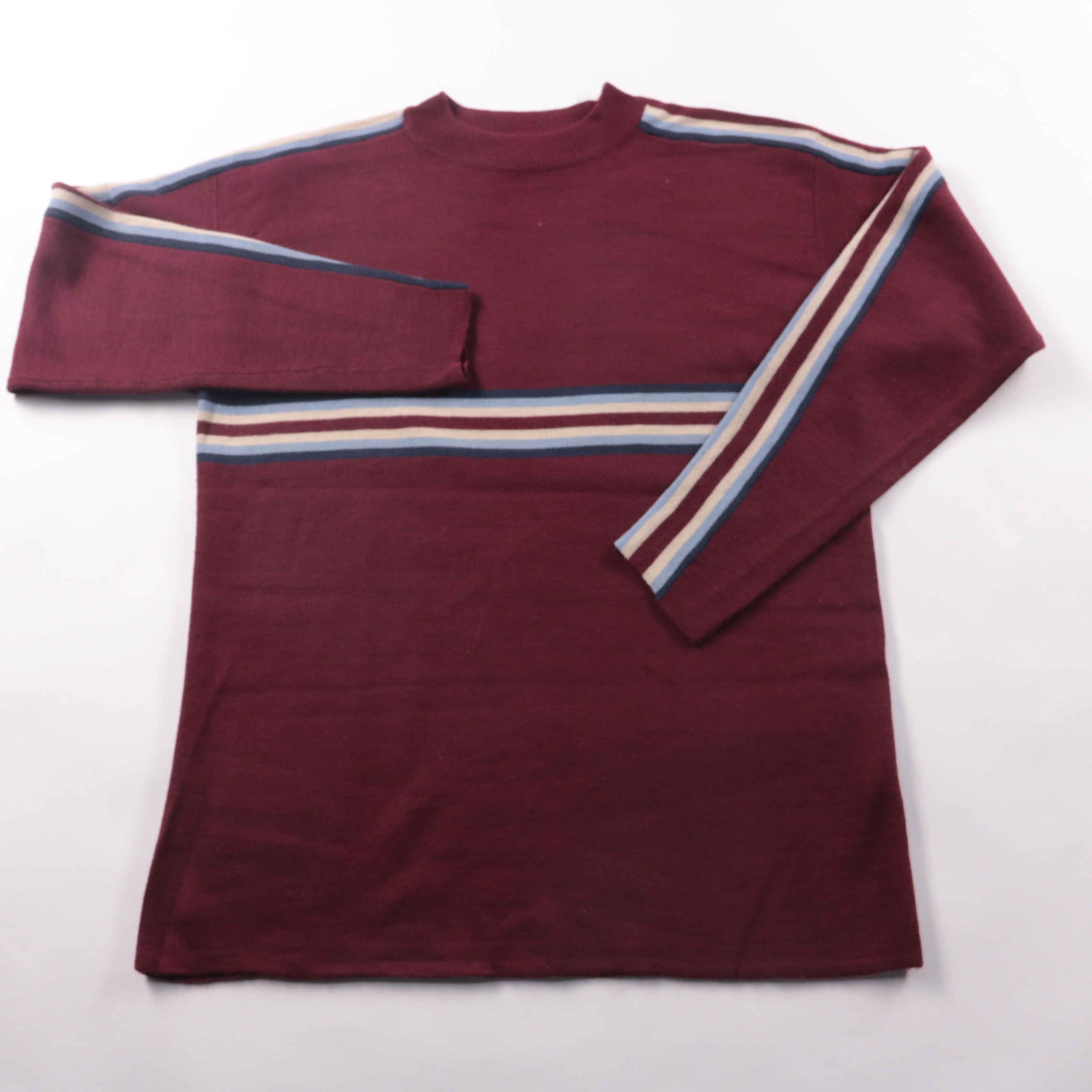 Мужской свитер Fishbone бордового цвета с контрастными полосами на груди и рукавах. Подойдёт для повседневной носки в прохладную погоду и сочетания с джинсами или чиносами. Трикотаж с добавлением шерсти даёт тепло и комфорт.