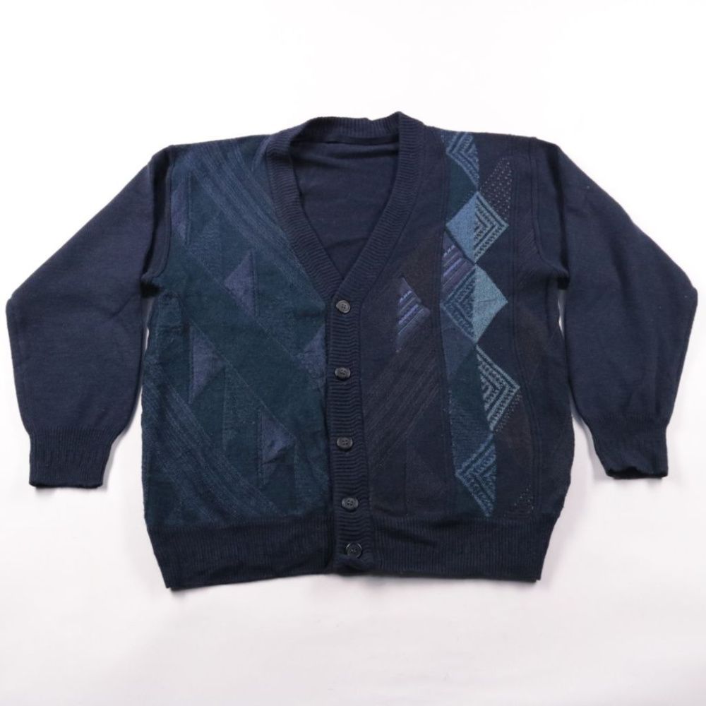 Мужской кардиган на пуговицах с V-образным вырезом и геометрическим жаккардовым узором в синих тонах. Подойдёт для повседневной носки в прохладную погоду и для офисных образов поверх рубашки или футболки. Практичный вариант: легко сочетать с джинсами и...