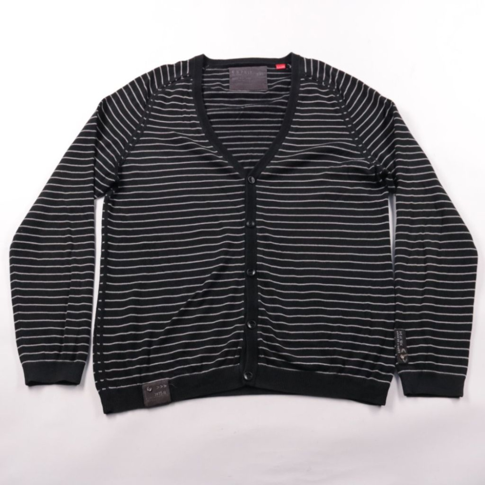 Мужской кардиган Esprit в черном цвете с тонкой белой полоской и V‑образным вырезом на пуговицах. Подойдет для повседневной носки в офис или на прогулки в прохладную погоду, удобно сочетать с футболкой или рубашкой. Хлопковый материал приятен к телу и ...
