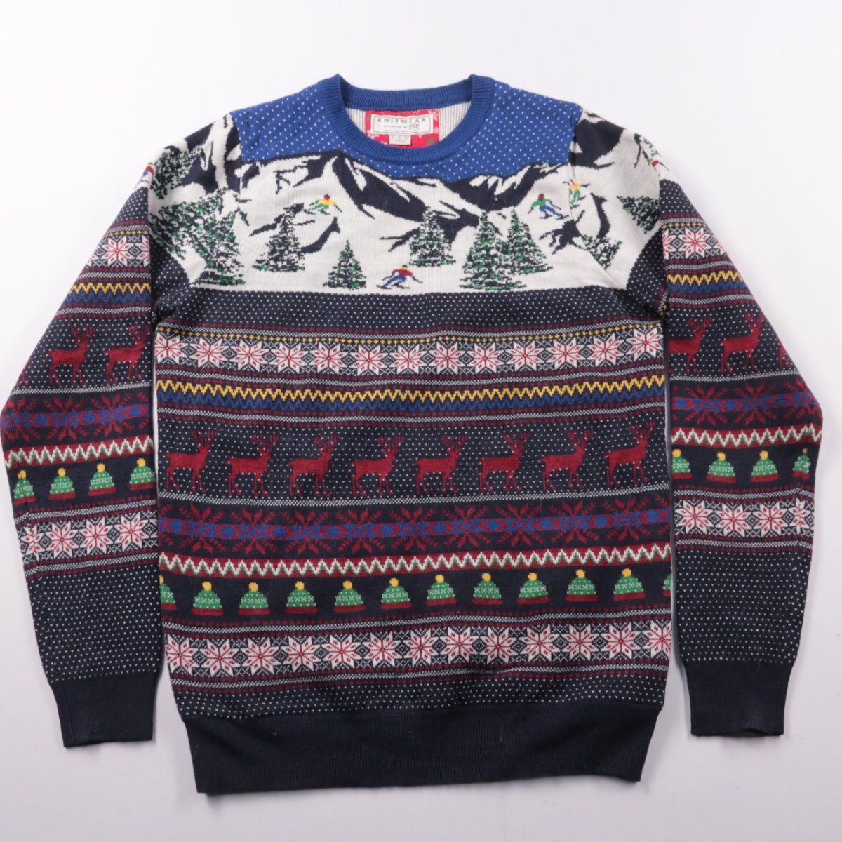 Мужской свитер F&F с зимним жаккардовым рисунком (олени, снежинки и горный пейзаж). Подойдёт для холодной погоды и праздничных/повседневных образов. Плотная вязка хорошо сохраняет тепло и комфортно носится поверх футболки.