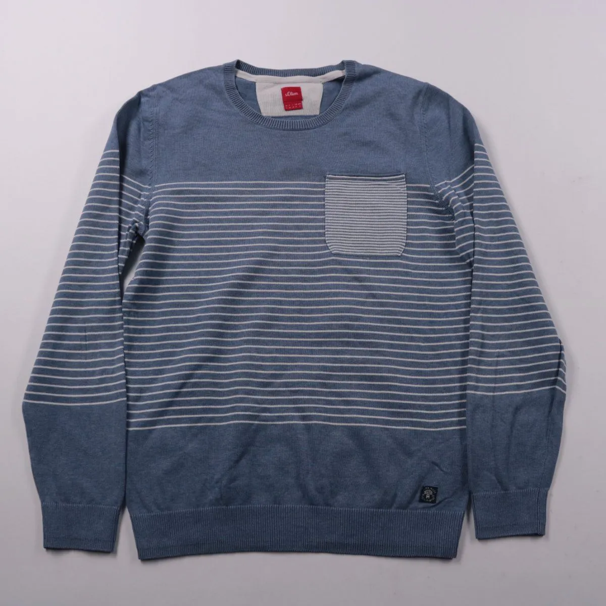Мужской джемпер S.Oliver синего цвета в тонкую полоску, с круглым вырезом и нагрудным карманом. Подойдёт для повседневной носки и офиса в стиле casual, легко сочетается с джинсами и брюками. Мягкий трикотаж тянется и комфортно сидит под курткой или пальто.