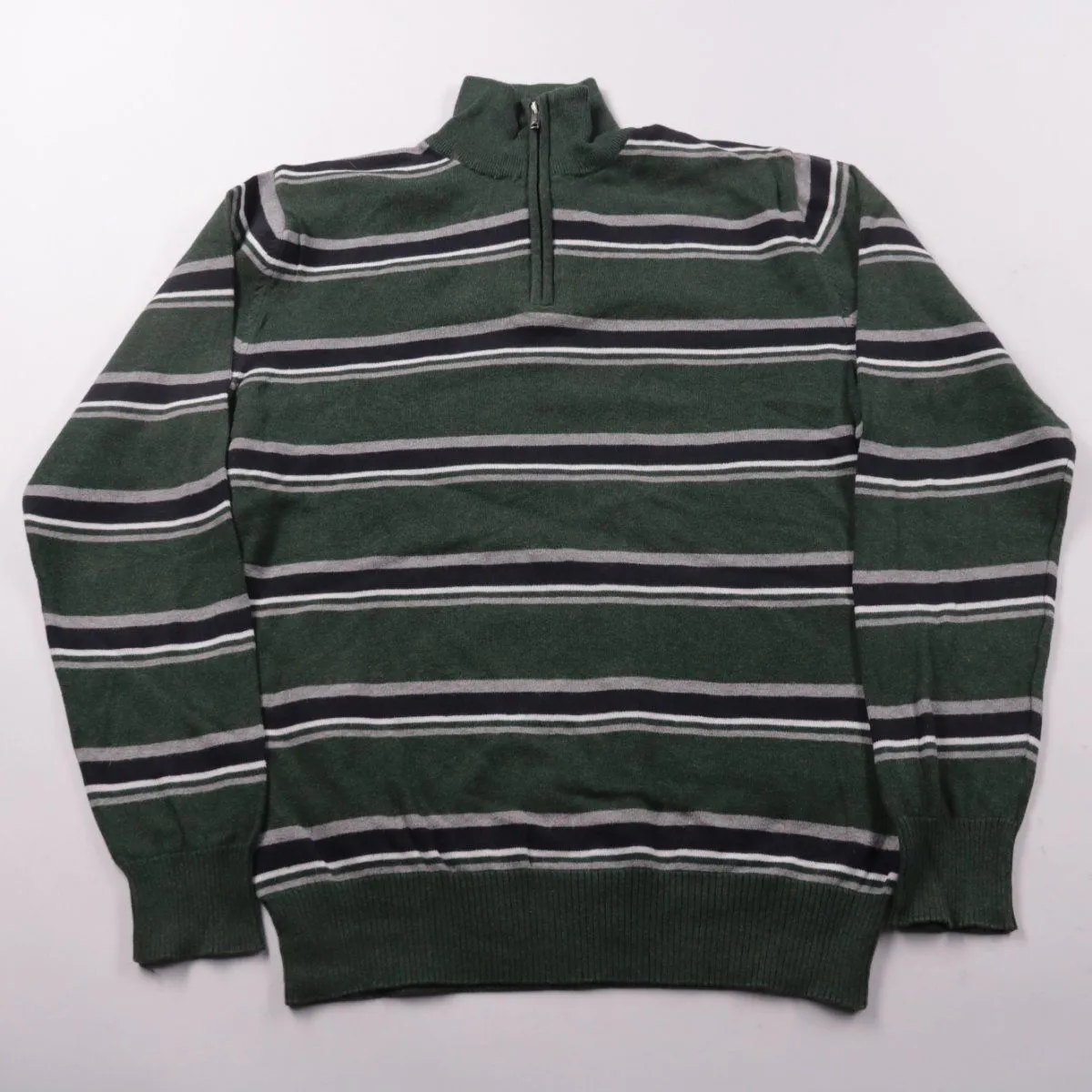 Мужской джемпер Canda из 100% хлопка, зелёный в горизонтальную полоску, с воротником-стойкой и молнией до груди. Подойдёт для повседневной носки в прохладную погоду и для офиса в стиле casual. Натуральный хлопок хорошо дышит и комфортен в многослойных образах.