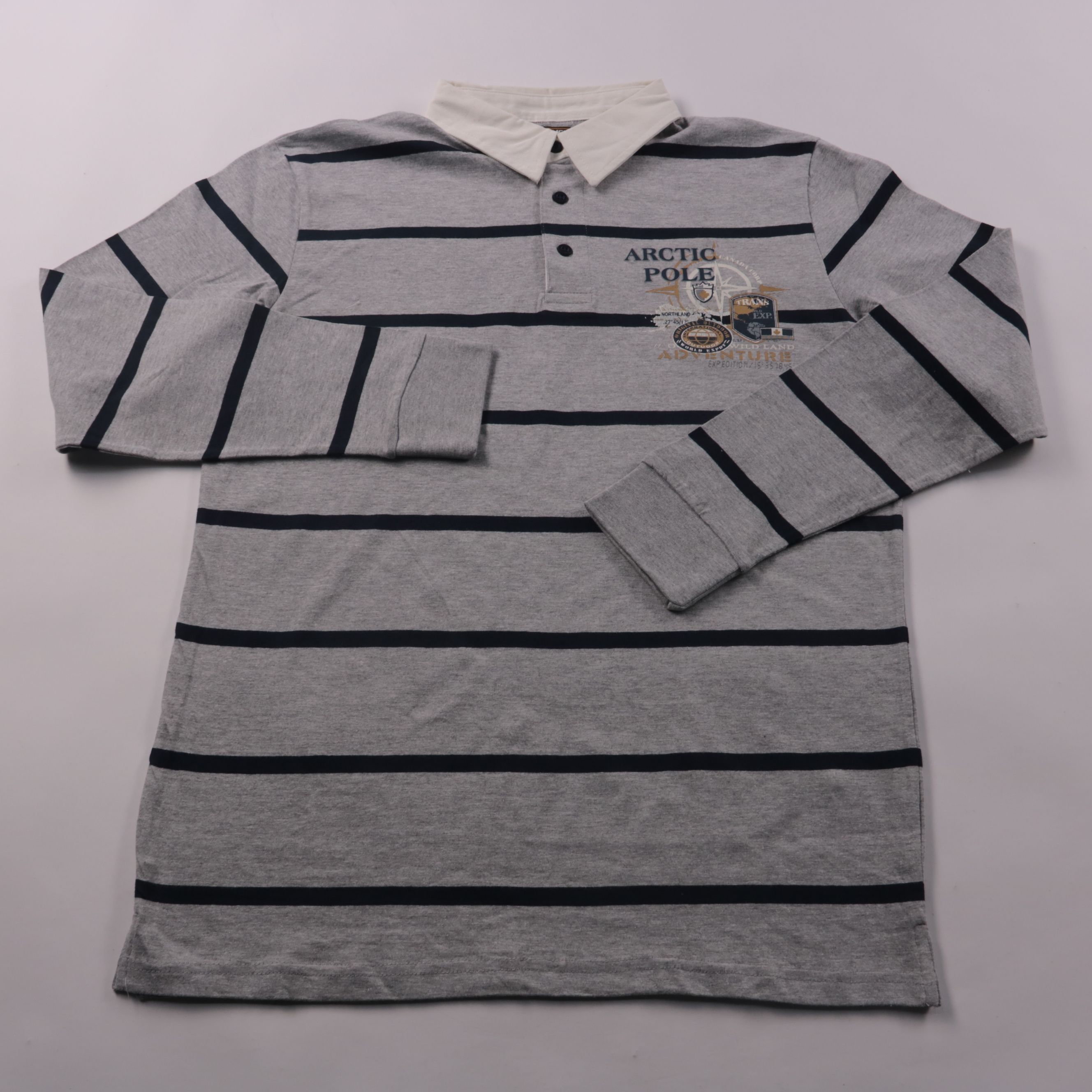 Мужское поло Atlas For Men с длинным рукавом, в серую основу с тёмно-синими полосками и белым воротником на пуговицах. Подойдёт для повседневной носки и casual-образов в прохладную погоду. Ткань хлопок с добавлением вискозы дышит и комфортна в носке.