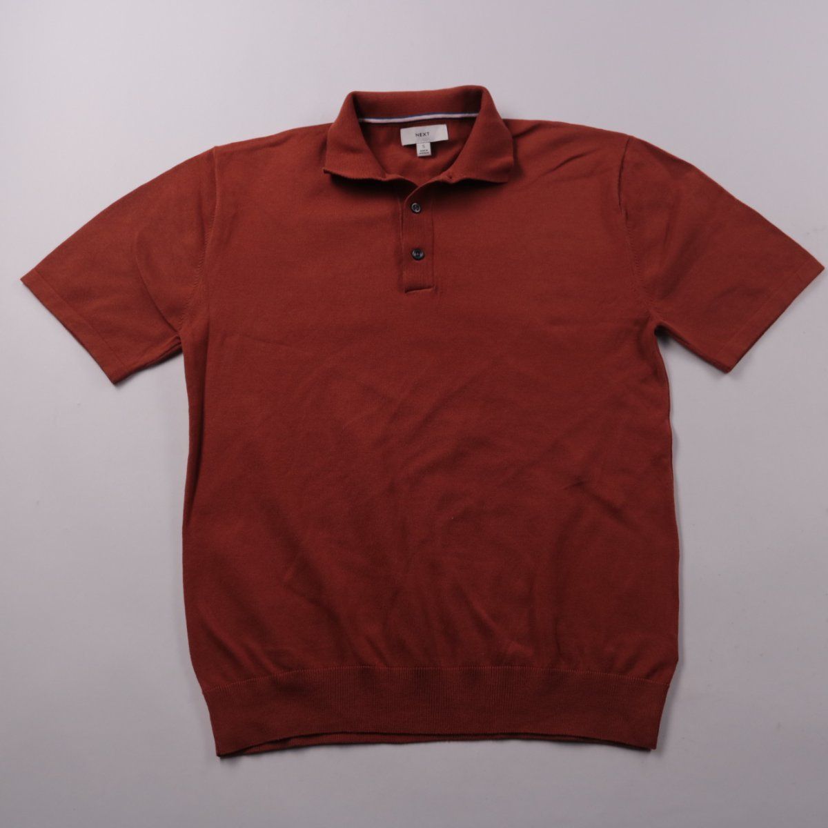 Мужское поло Next кирпично-бордового (терракотового) цвета с коротким рукавом и застёжкой на пуговицы. Подойдёт для повседневной носки и офисного casual в тёплую погоду. Смесовый состав с нейлоном делает ткань более износостойкой и лучше держит форму.