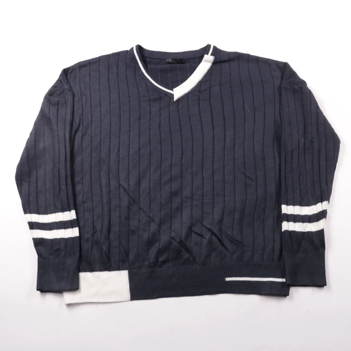 Мужской джемпер из акрила с V-образным вырезом, выполнен в тёмно-синем цвете с белой окантовкой и полосками на рукавах. Подойдёт для повседневной носки в прохладную погоду и легко сочетается с джинсами и брюками. Практичен в уходе и быстро сохнет.