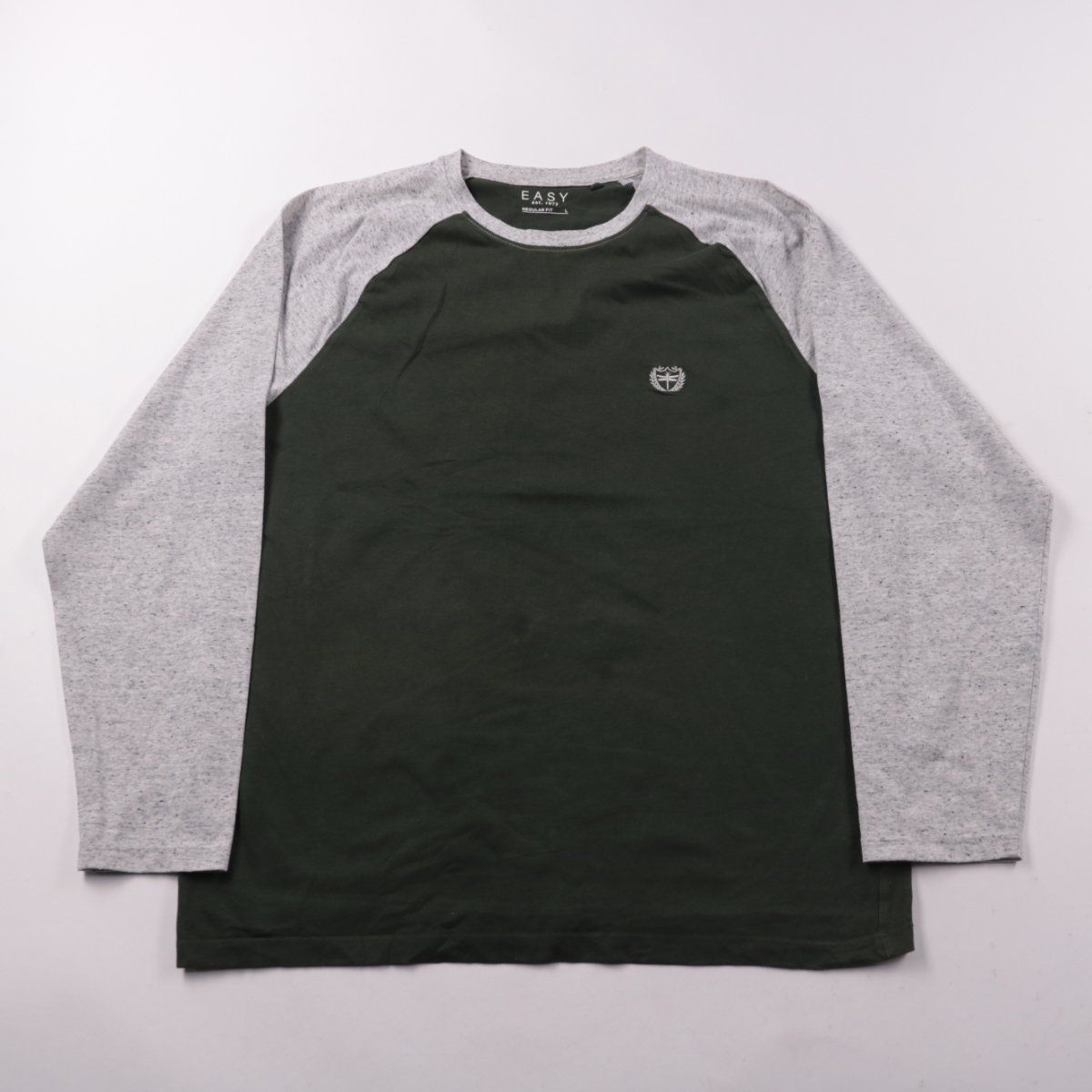 Мужская футболка Easy Regular Fit с длинным рукавом реглан: тёмно-зелёный корпус и серые меланжевые рукава. Подойдёт для повседневной носки и в качестве базового слоя в прохладную погоду. Хлопковый корпус приятно ощущается на теле и хорошо дышит.