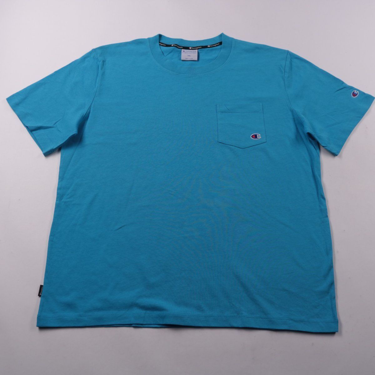 Мужская футболка Champion голубого цвета с нагрудным карманом и небольшими логотипами. Подойдёт для повседневной носки и прогулок в тёплую погоду, легко сочетается с джинсами и шортами. Хлопковая ткань хорошо дышит и проста в уходе.