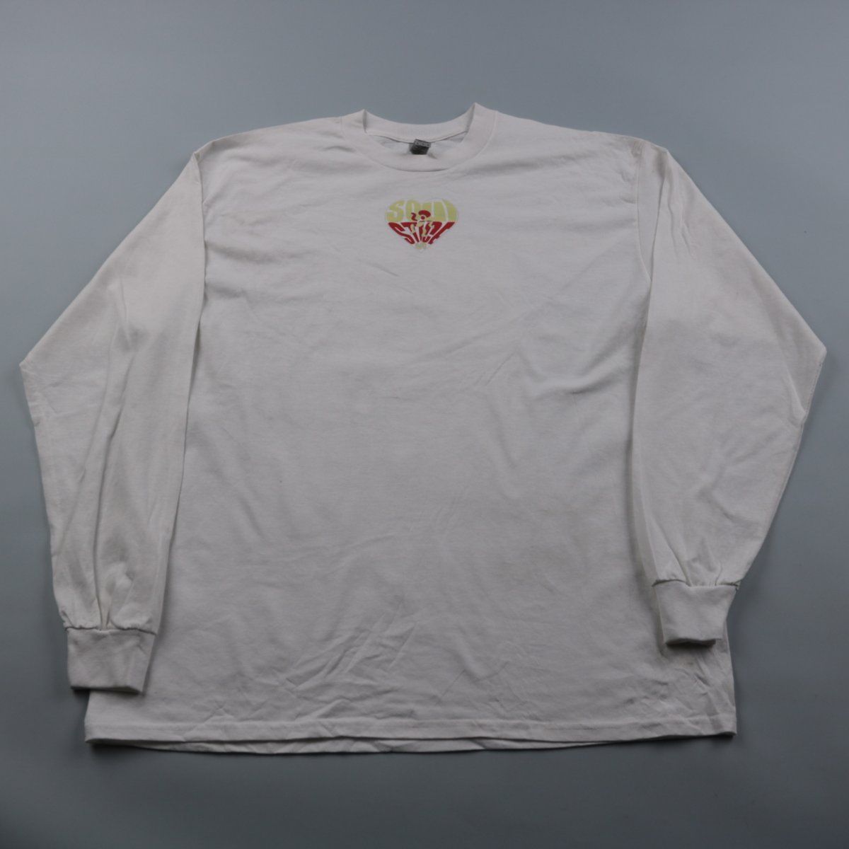 Лонгслив Gildan из плотного хлопка белого цвета с небольшим принтом спереди и крупным принтом на спине. Подойдёт для повседневной носки и под слой в прохладную погоду. Хлопковая ткань хорошо дышит и комфортна в носке.